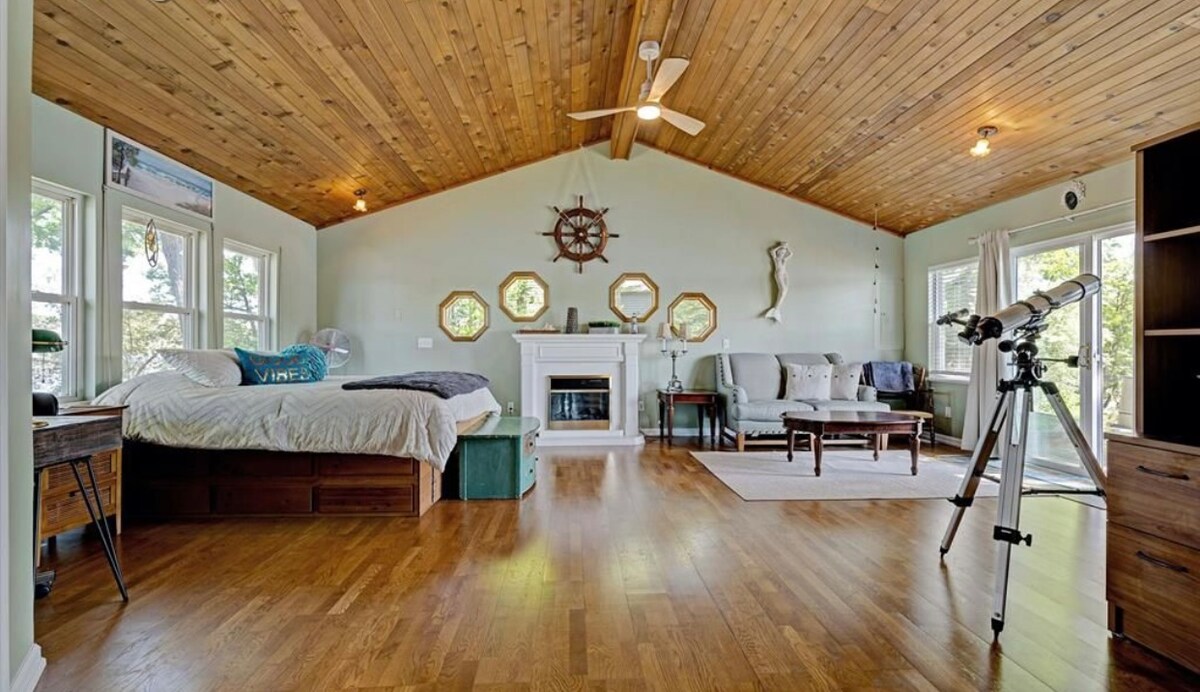 A-Frame ta' Nofs is-Seklu tal-1964 - vaganza romantika. Mixja qasira lejn il-lag, lott kbir imsaġġar, fossa tan-nirien fuq barra, ikla, grill tal-BBQ, hot tub u roti. Kamra tal-banju kbira w/ jacuzzi tub, pjan ta 'sular miftuħ w/kċina kbira u żona tal-għajxien w/fireplace elettriku. Żewġ kmamar tas-sodda 'l fuq. Il-kaptan għandu sodda doppja' queen', spazju għax-xogħol u gallarija. Kamra tas-sodda ta 'quddiem w/2 futons u tħares lejn is-salott. Kamra tal-logħob tal-kantina w/ sauna, mejda tal-pool, foosball, shuffleboard, Jenga u ħwejjeġ. Qrib ix-xiri, il-golf, ir-resort tal-iskijjar, il-mitħna tas-sidru.