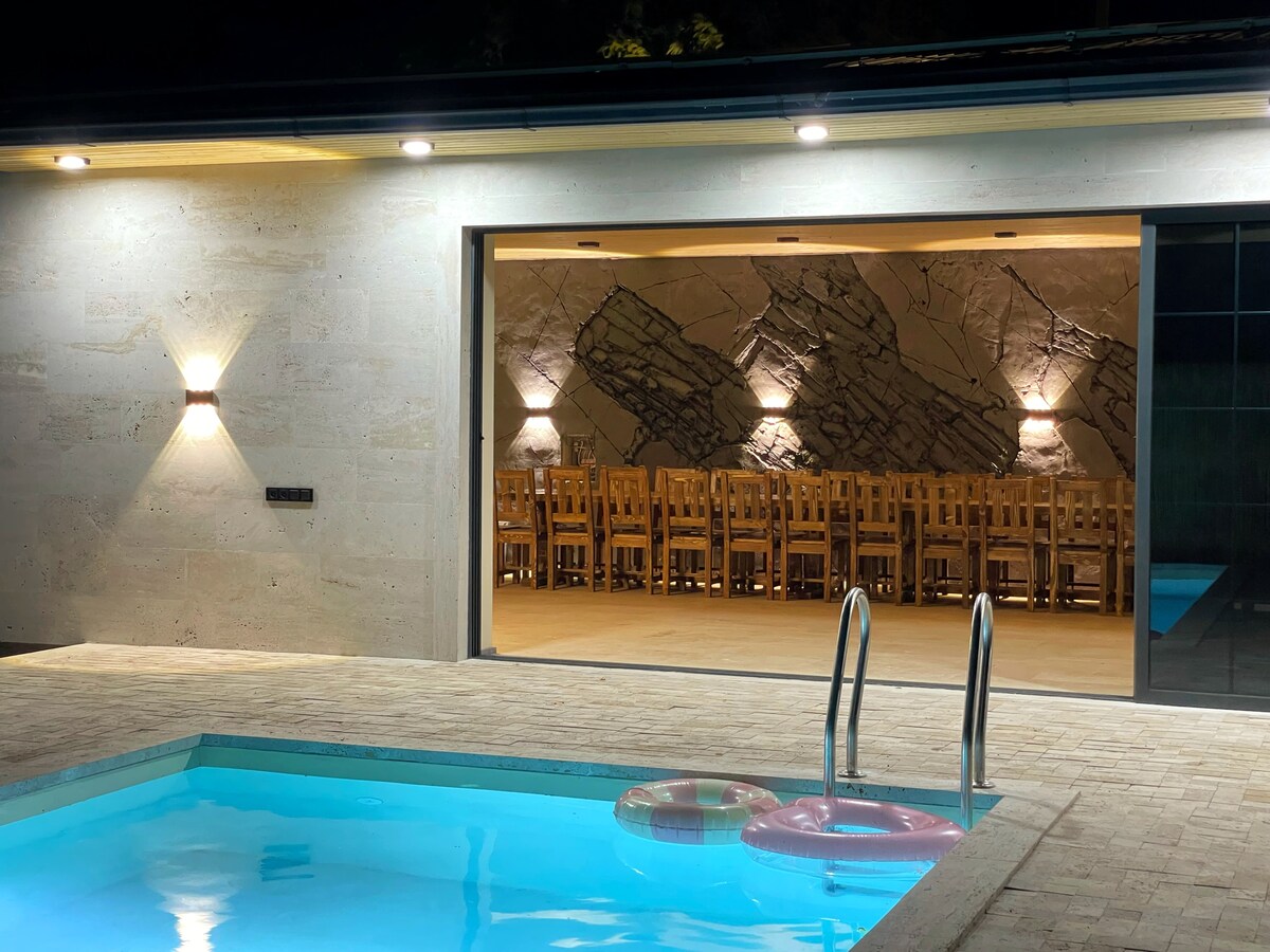 AURA hija post għall-mistrieħ fil-muntanji ħdejn il-Park Nazzjonali ta' Dilijan, imdawra b'foresta mhux missa mill-bniedem. Id-dar tinsab qrib il-Knisja ta' Ahavnavank tas-seklu 11, post antik b'atmosfera speċjali ta' paċi u storja. Din hija dar b'waħda mill-isbaħ veduti ġewwa Dilijan, fuq art ta' 3400 m². Id-dar tal-ġebel hija mfassla biex toffri privatezza, trankwillità u rilassament sħiħ 'il bogħod mill-ħajja ta' kuljum.