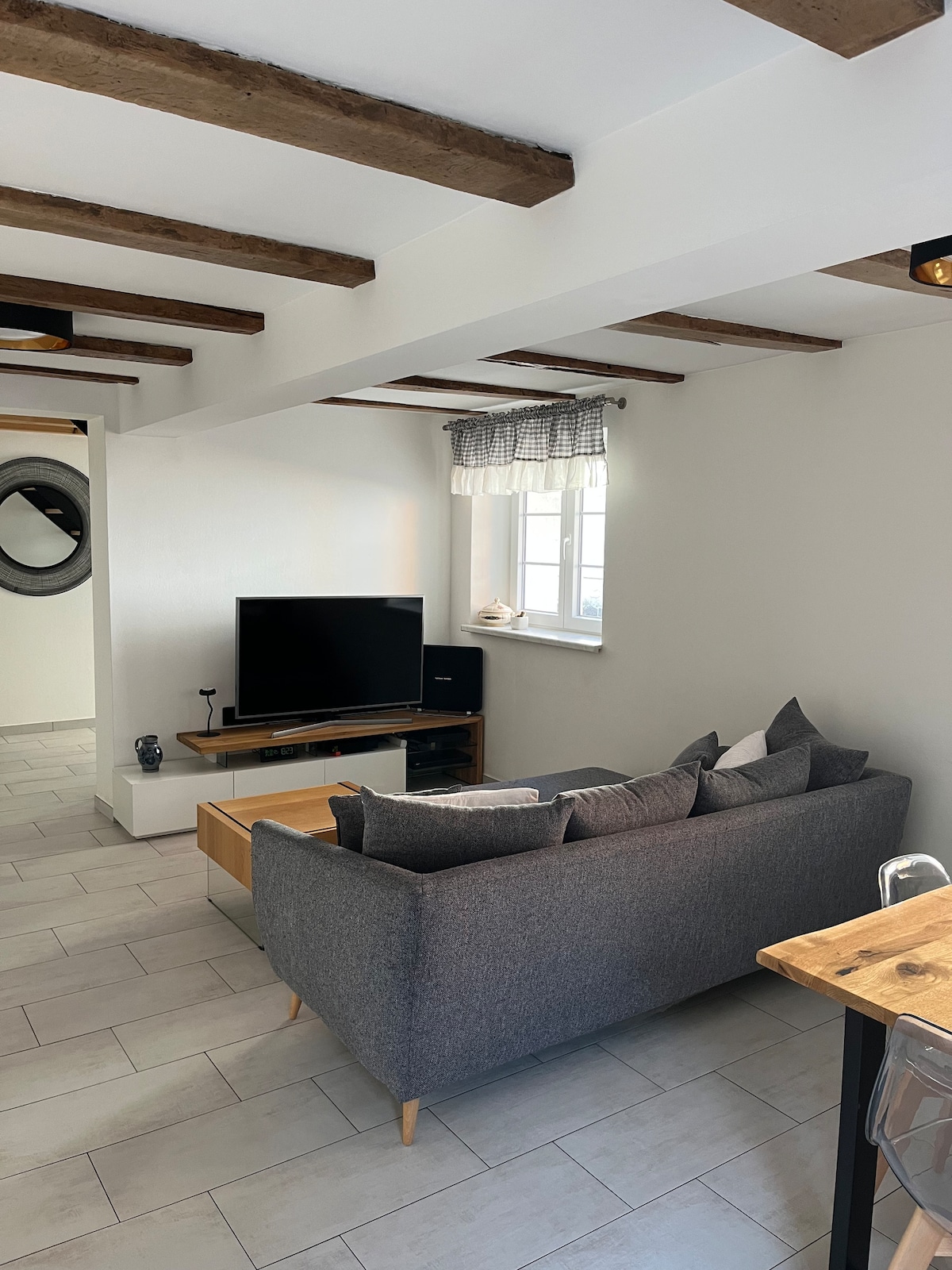 Au cœur du parc régional des Vosges du Nord le gîte (ancienne grange) fait partie d’un corp de ferme du 18ème siècle entièrement rénové. Le duplex de 45m² possède une terrasse privative de 22m² avec vue sur les vignes et vergers. Le logement est doté d’une cuisine équipée, d’un salon, une salle d’eau avec douche italienne, une chambre à coucher (lit 180x200cm) et d’un garage (parking pour voiture électrique). Logement non-fumeur.