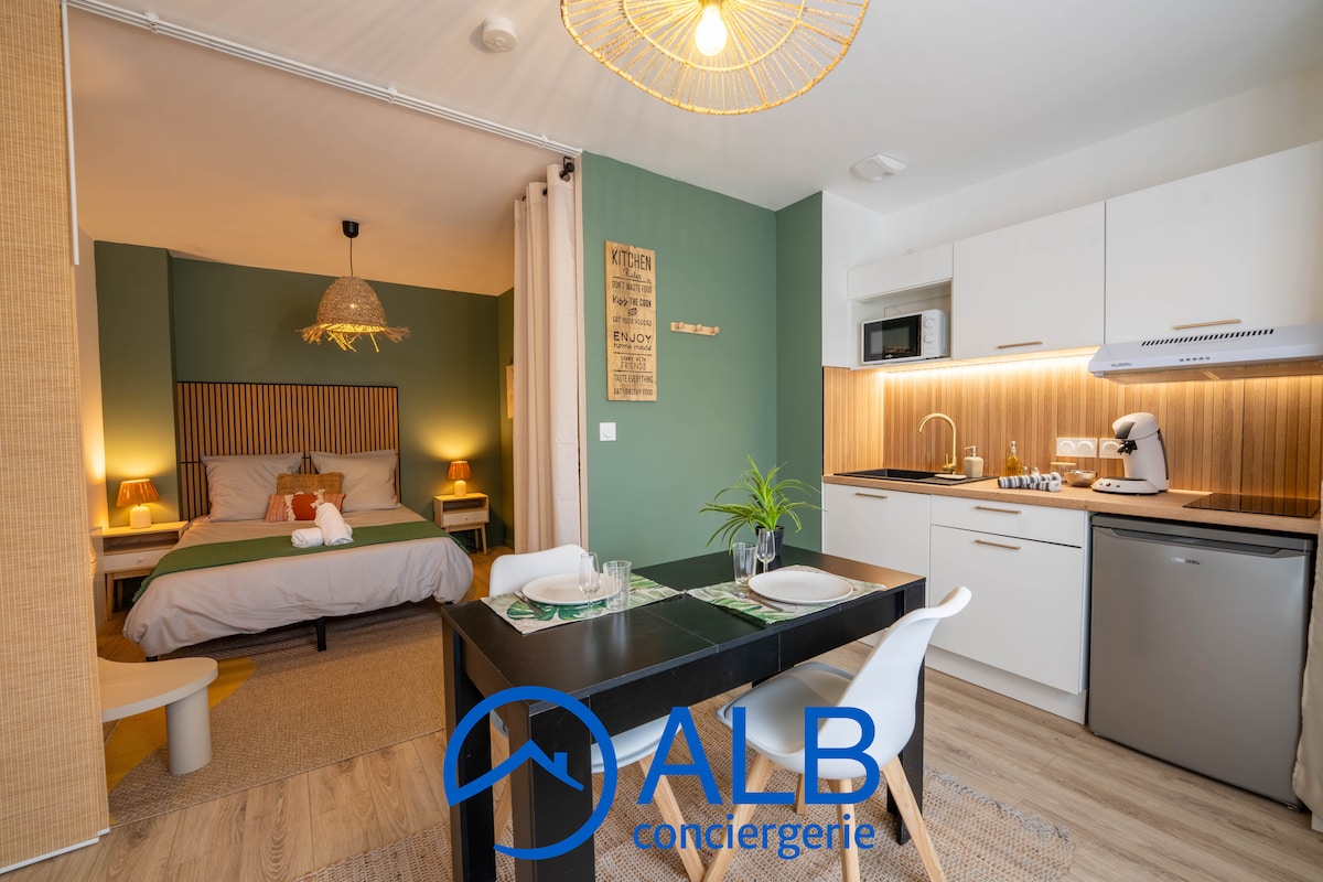 Studio de 30m² dans notre maison, refait en 2022. Pour 3 ou 4 personnes. 1 lit 140x190 + 1 clic-clac, une salle de bain avec douche et baignoire, une cuisine équipée. Draps et serviettes de bain fournis. Parking gratuit. Poussette canne, lit parapluie et chaise haute en prêt sur demande. À 5 mn en voiture du centre de Baud et de la 4 voies. À 10mn en voiture du Clos du Grand Val. Vous disposez d'une partie de la terrasse avec une table pour les repas en extérieur ainsi qu'un accès au jardin.