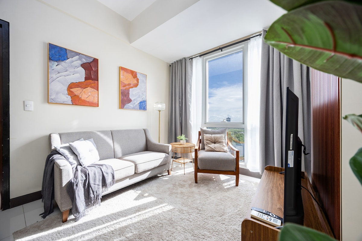 Monochromatic tones and plush textures welcome you into this beautifully designed 37 sqm studio in Tambuli Seaside Living. Enjoy a queen-size bed, a cozy sofa bed, fast Wi-Fi, and a fully equipped kitchen, plus a private balcony overlooking the Hilutungan Channel. Free access to the condo’s exclusive pools completes this relaxed, resort-style escape just minutes from Mactan Airport.