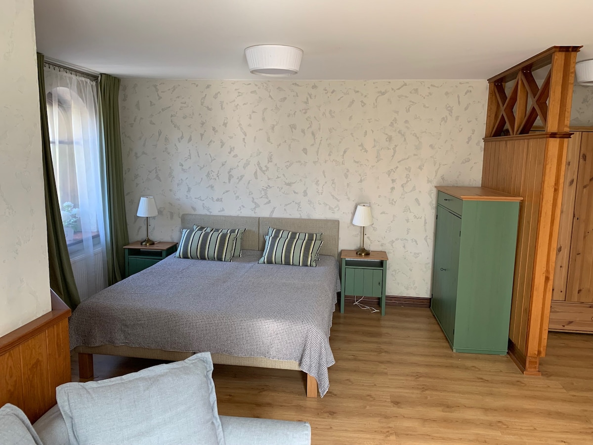 Appartament spazjuż fi studio, mgħammar b' togħma u komdu. Żona tal-kċina bit-tagħmir meħtieġ. Żona tax-xogħol b' WiFi disponibbli bla ħlas. Żona ta 'lounge bit-TV. Doċċa rilassanti biex tgawdi minn irqad ħelu f' sodda komda. Kollox investiga b' ħafna imħabba. Biex nieħdu ħsieb il-benesseri tal-klijenti tagħna, ħloqna wkoll bode ta' Spidala biex insibu snacks mimlija togħma u ikliet sbieħ eżatt fuq il-post! Il-lukanda b' disinn "Dar ta' Spidala" tinsab fil-belt il-qadima ta' Cesis. Iż-żona tal-lounge fil-bitħa tad-dar hija disponibbli wkoll matul ix-xhur sħan tas-sena.