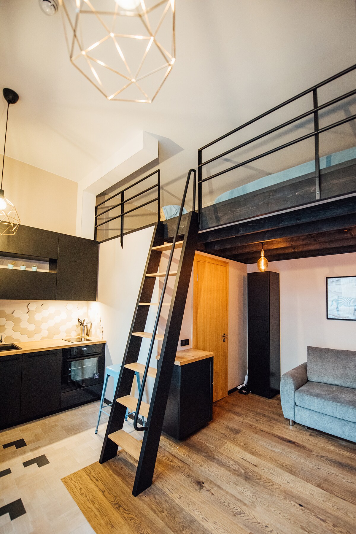 Escape to a unique loft in Riga's prestigious Art Nouveau 'Bibliotēkas nams.' This quiet 45 m² sanctuary for two features a balcony overlooking a peaceful courtyard, yet is steps from Elizabetes Street's vibrant life. Renovated with a bio-fireplace, full kitchen, and a cozy mezzanine bedroom, it's your perfect base for exploring the city. Walk to Old Town and the National Opera in minutes. With dedicated workspace, portable air conditioning and fast Wifi