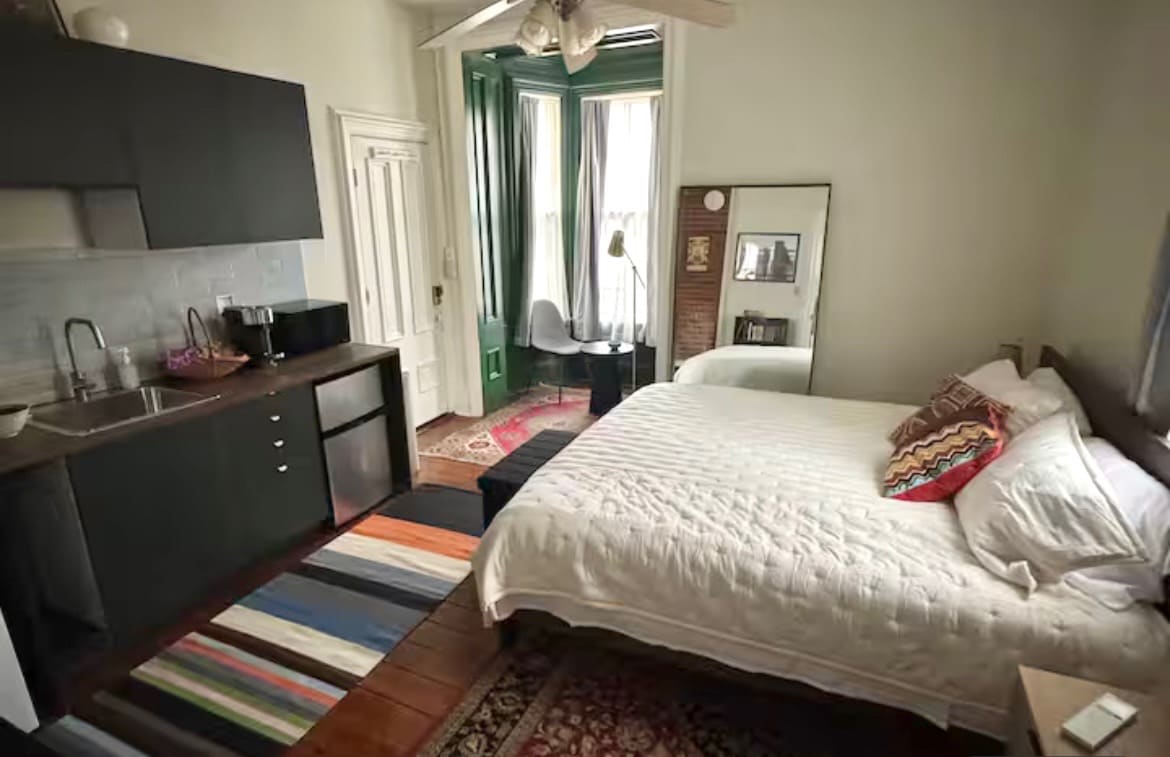 Oqgħod fiċ-ċentru tal-belt qrib ristoranti, ħwienet tal-kafè, xiri u wirjiet. Ftit blokki biss 'il bogħod mill-Granada u l-Librerija. Mil 1 biss sal-kampus ta 'KU u 2 mili lejn I-70. Il-guesthouse għandha daħla bil-madum b' titjira waħda ta' taraġ bit-twapet. Il-kċina għandha armarju abjad b 'countertops silestone, microwave, firxa, magna tal-ħasil tal-platti u friġġ. Iż-żona tal-ħasil tal-ħwejjeġ għandha magna tal-ħasil, dryer u ħiter tal-ilma mingħajr tank. Il-banju għandu vanity abjad b 'counter Silestone, u mina tax-xemx.