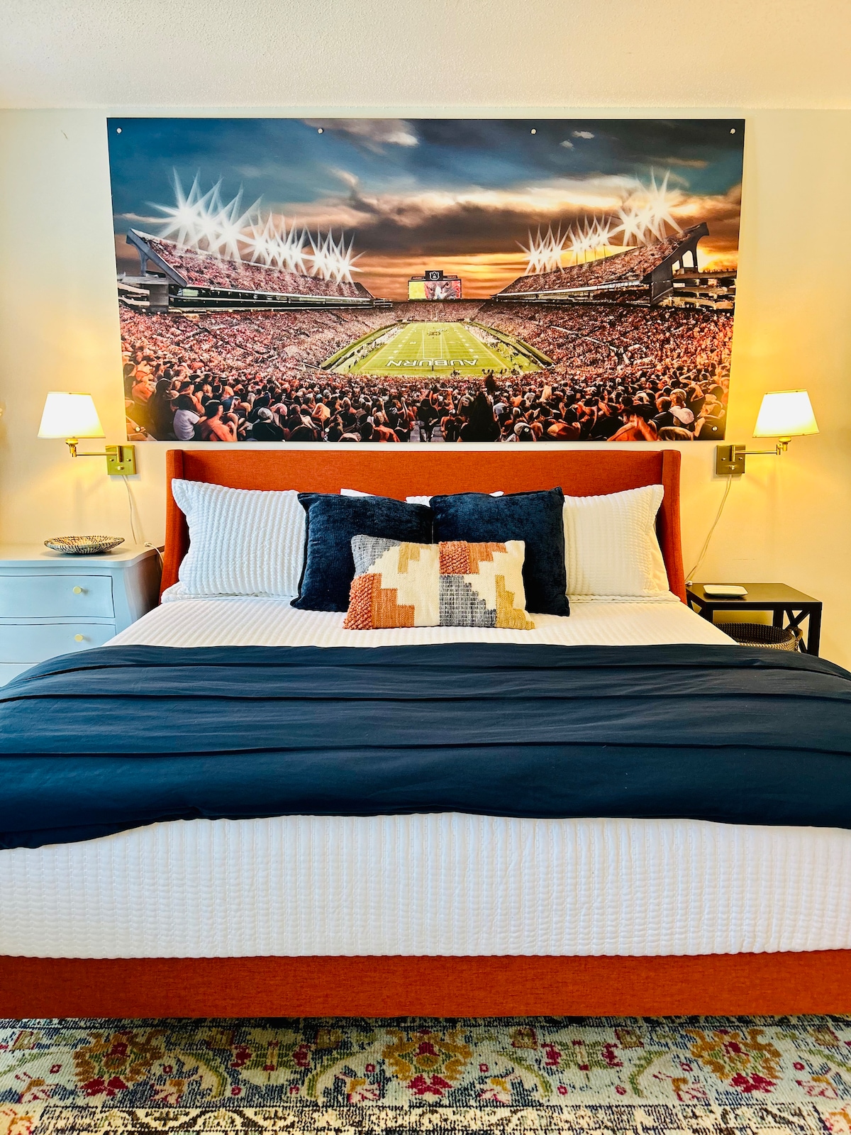 Book now! Sleep 7 adults+2 kids. House is perfectly located just a few blocks to downtown & Auburn University. Quick commute to any campus location. Jordan Hare is only 7 1/2 blocks away! Ideal for families, business travel & any small groups visiting town. Fully Equipped Kitchen. All 3 bedrooms are upstairs, each w/ a full bath & walk-in closet. Auburn Theme Escape Game for guests. The fenced yard has seating, a fire pit and a grill. Parking for 5 cars: 2car garage+3 driveway.