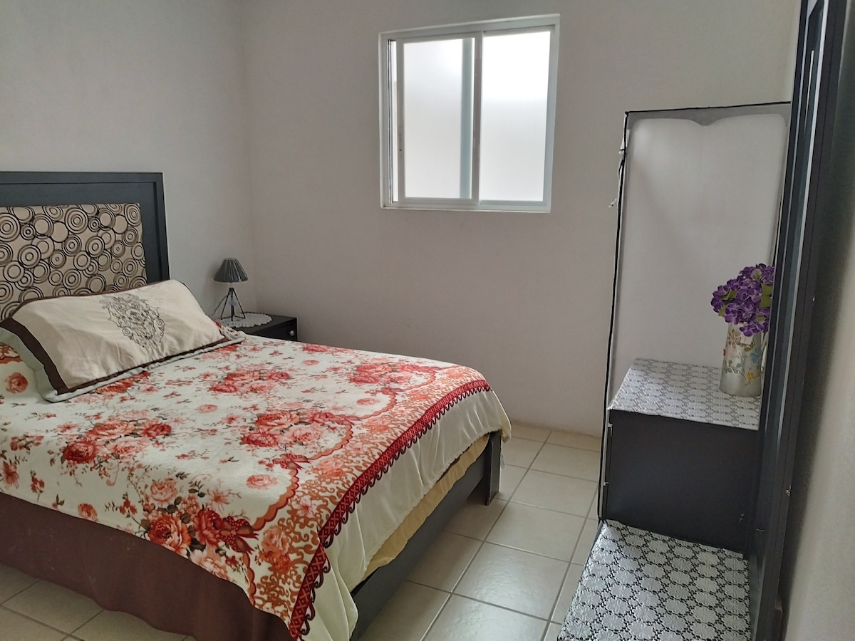 Habitación básica con cama matrimonial para huéspedes en lugar seguro, cerrado, con acceso a internet de alta velocidad. Estacionamiento dentro de la propiedad. Nos encontramos a 10 minutos del aeropuerto internacional del bajío a las afueras de la ciudad de Léon.