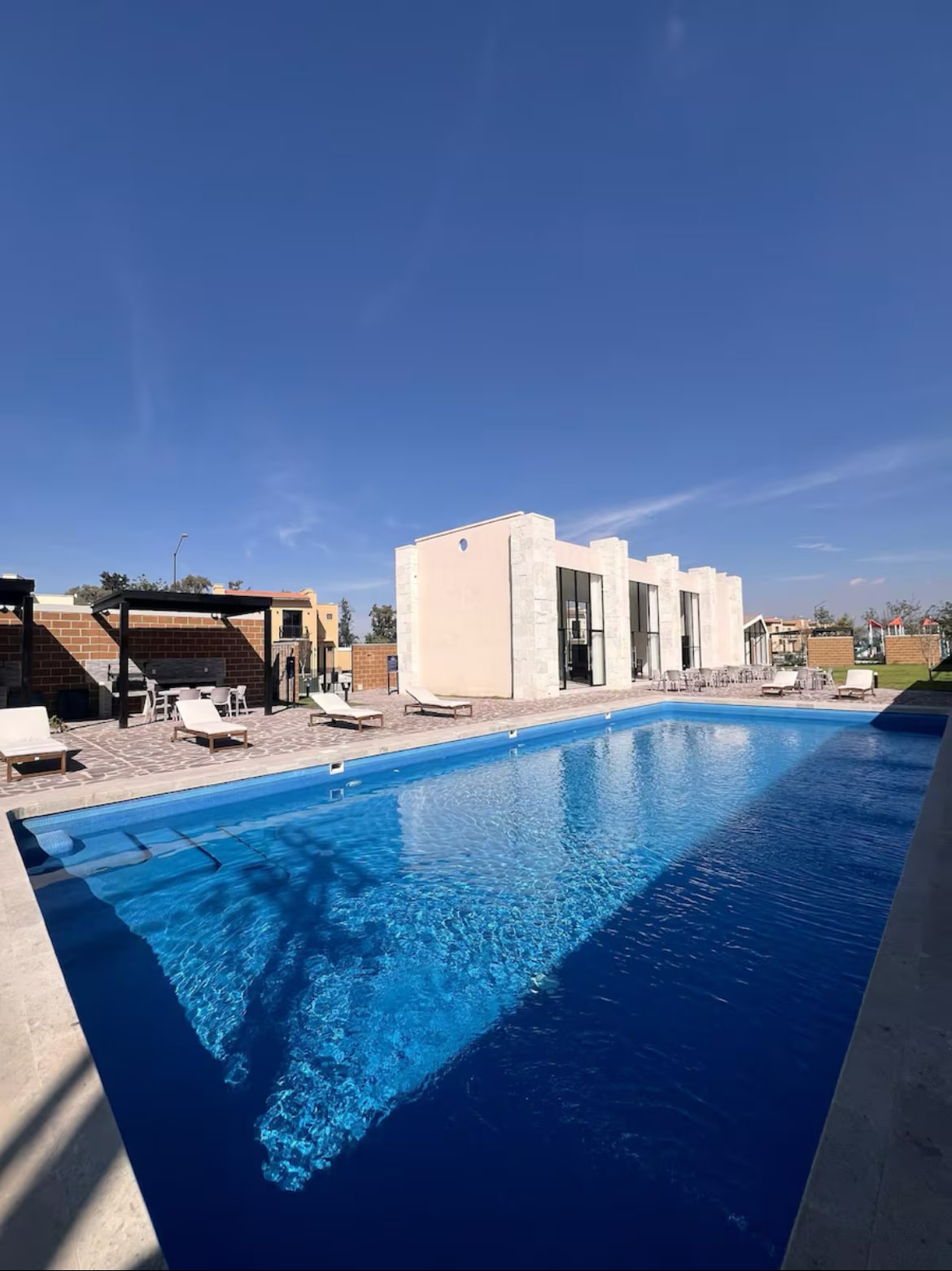 Dar b' żewġ sodod doppji tnejn u nofs kmamar tal-banju għal erba' persuni b' barbecue u hammock ħdejn il-ħwienet tal-Polyforum u l-ajruport privat tal-FRACC bi gwardjani. Il-pixxina hija maqsuma mal-oħrajn u hija bbukkjata fi blokok ta' sagħtejn. Jekk se tużah. Jekk jogħġbok għidilna l-iskeda.