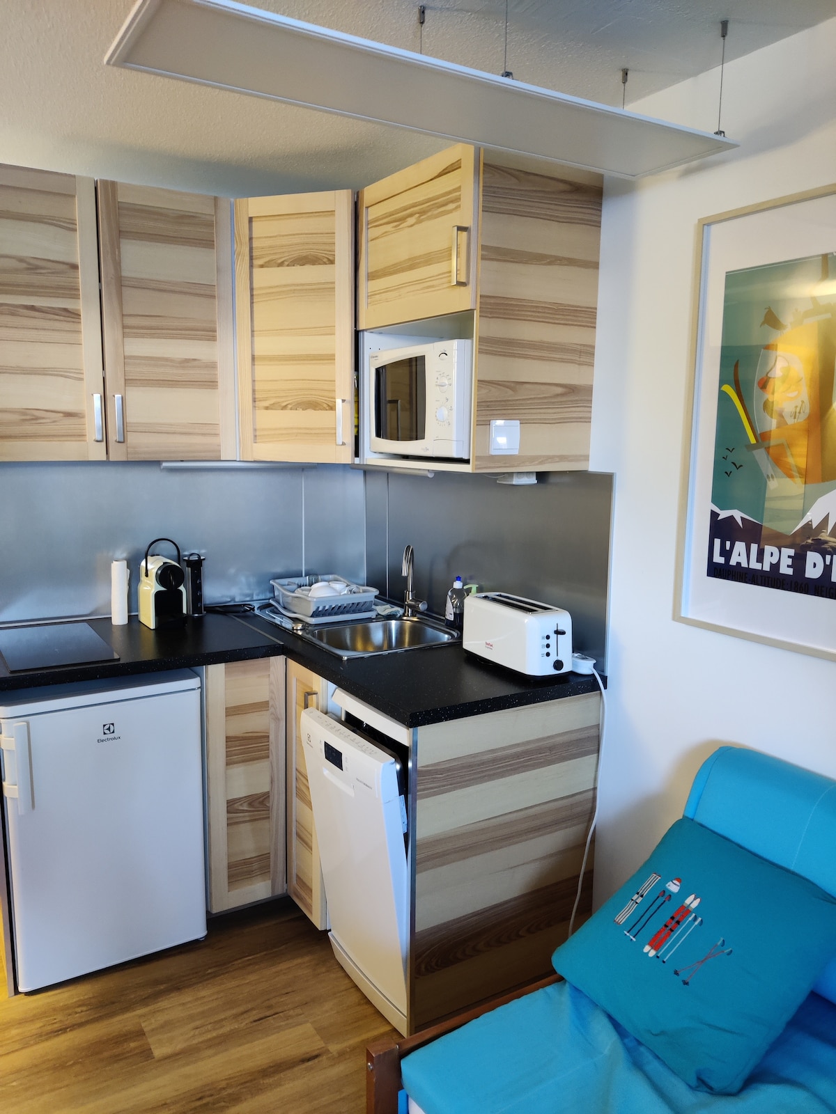 Renovated 28 m² apartment no. 701 on the 7th floor with stunning mountain views and sunsets (Résidence Écrin d’Huez). 200 m from the Bergers center and 300 m from the ESF Chalet. Fiber Wi-Fi, balcony, equipped kitchen (dishwasher, microwave with grill, raclette/fondue appliances). Comfortable sleeping for 5: sofa bed (140x190) and bedroom with bunk beds. Modern bathroom with walk-in shower. Ski locker. Coin laundry (paid). Secure bike storage. Free parking across the street.