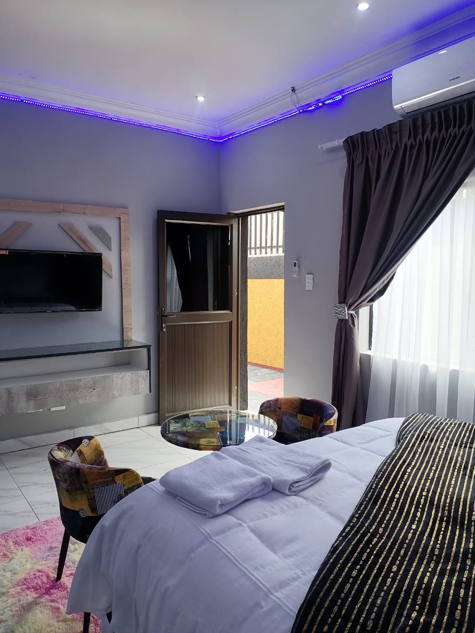 Kamra self-catering ġewwa Luxury Guest House ġewwa Paulshof, Sandton. Il-kmamar kollha għandhom aċċess fuq barra tagħhom: għalhekk tista' tiġi u tmur kif trid, huma flimkien ma' doċċa, TV individwali tal-WiFi bla ħlas b' DSTV. Hob, kitla, toaster, microwave, borom u taġnijiet, pożati, oġġetti tal-ħġieġ, friġġ tal-bar onest, platti, tazzi eċċ bit-te/kafè. Kolazzjon disponibbli fuq talba bi ħlas addizzjonali. BBQ / Braai disponibbli. Enerġija solari biex tiġġieled il-qtugħ tal-elettriku. Żjarat fit-tul 2 oġġetti tal-ħasil kuljum.