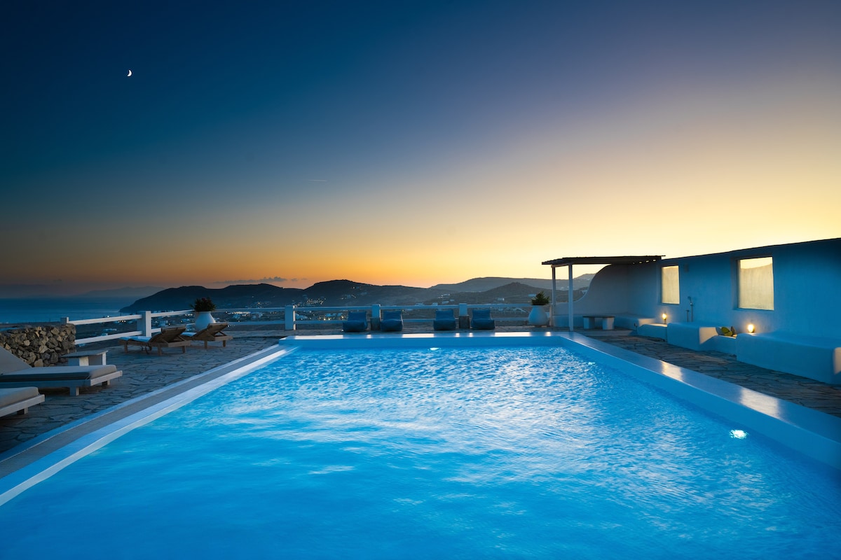 Suite lussuża ta' 39 m² + terrazzin ta' 45 m² b'pixxina privata, Jacuzzi ta' barra għal 3 persuni u veduta panoramika tal-baħar. Jinkludi sodda queen b'saqqu anatomiku, sufan bil-rix tal-wiżż (tista' torqod persuna oħra fuqha), kċina sħiħa, Smart SAMSUNG TV ta' 55" b'Netflix b'xejn u sistema tal-ħoss Bluetooth Hi-Fi SONY. Terrazzin mgħammar kbir bi spazju għall-ikel fuq barra u stil ċikladi. Gawdi minn privatezza sħiħa, kumdità ta' 5 stilel u għajnuna minn concierge. Ideali għal koppji jew familji żgħar li qed ifittxu ħarba unika, privata u straordinarja f'Mykonos.