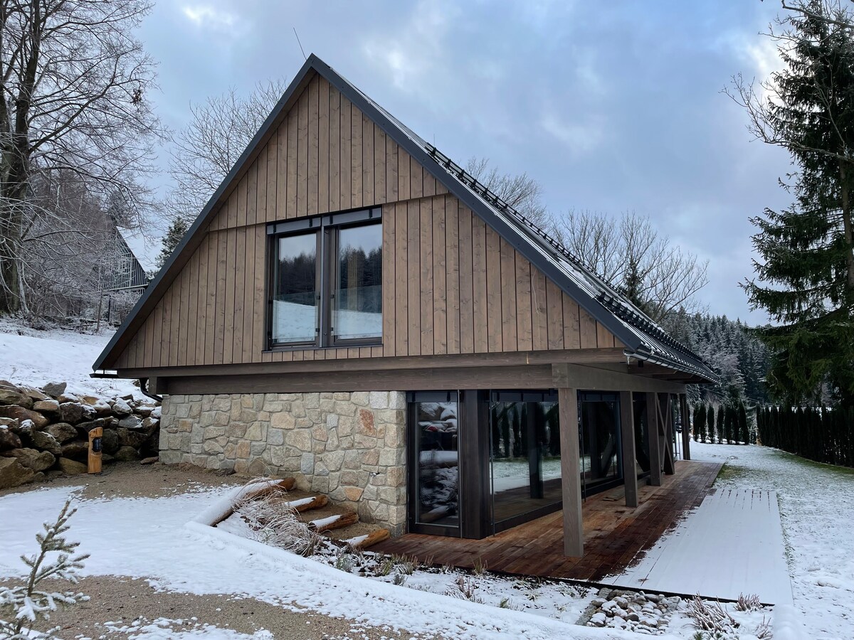 Ejja u rrilassa mill-ħajja ħerqana sal-cottage tagħna fil-qalba tal-Muntanji Ġganti. Il-kumditajiet kollha mill-ilma sħun sal-arja kkundizzjonata huma kwistjoni. Terrazzin tal-ħġieġ jippermettilek tgawdi s-sbuħija tan-natura tal-madwar mill-kumdità ta 'ġewwa. Hawnhekk tista 'tgawdi kafè ta' filgħodu jew ikla romantika. Hemm kċina mgħammra b 'kollox u grill fuq barra. U l-benesseri? Fil-hot tub fuq barra tagħna matul is-sena kollha, se tinsa t-tħassib kollu tiegħek!