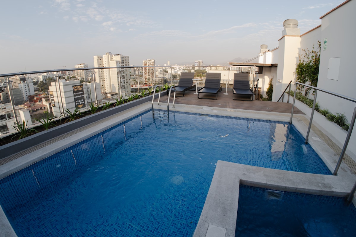 Loft tal-premiere modern, li jinsab tajjeb ħafna u b 'veduta panoramika mill-35 sular. Aċċess faċli għal toroq ewlenin, ċentri kummerċjali, mużewijiet, ferrovija, ċentru finanzjarju, kliniċi, gyms, parks. Għandha kamra tal-ħasil, kamra tal-banju ewlenija, kċina mgħammra, ilma sħun, TV u WIFI. Żoni komuni: Perspettiva tal-belt, Bejt, Ko-ħidma. Qrib distretti turistiċi bħal Miraflores, Barranco u Centro Histórico de Lima.