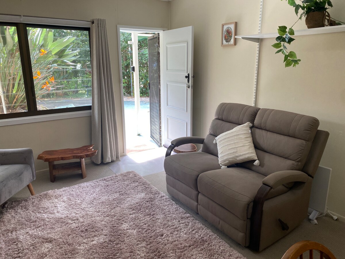 Cottage tal-ġnien trankwill. Sewqan qasir mir-raħal storiku ta 'Newrybar, 15-il minuta mill-bajjiet ta' Bangalow u Lennox Head u 25 minuta biss lejn il-Bajja ta 'Byron. Aħna tajbin għall-pets! Salott miftuħ, kċina moderna u kamra tal-banju unika, kollha bi twieqi kbar li jdaħħlu l-arja fil-beraħ. Gverta mgħottija banju fix-xemx + tħares lejn il-ġnien li taqsam ma 'tiġieġ ta' salvataġġ li jqiegħdu bajd friski għall-kolazzjon! Il-bibien jiftħu direttament mill-kamra tas-sodda sat-2 deck għad-dell mill-kenura ta 'siġra ta' Poinciana