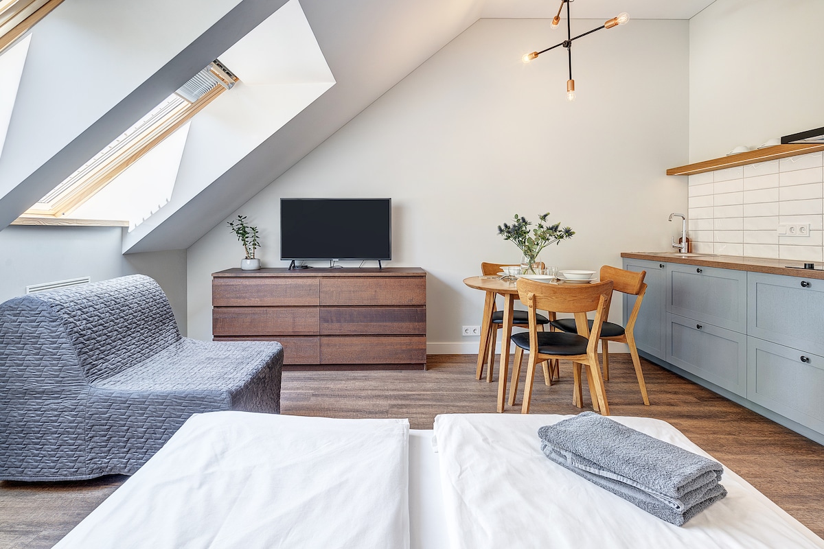 Dan huwa appartament ġdid fjamant fl-istudio. f 'bini ta' belt antika li għadu kif inbena mill-ġdid f 'post mill-aqwa, it-tielet sular! Dan huwa 1 minn 8 unitajiet residenzjali f 'dan il-bini. Il-post huwa komplut bi kċina mgħammra sew, TV, AC, sodda doppja 'queen', salott. Domillion għandha ħafna appartamenti fil-belt l-antika ta 'Vilnius - jekk din ma tgħoddx għalik bl-ebda mod, ibgħatilna linja, noffru xi ħaġa oħra. Jekk inti grupp - għandna diversi modi kif nilqgħu grupp ta 'kwalunkwe daqs fil-qrib - għidilna.