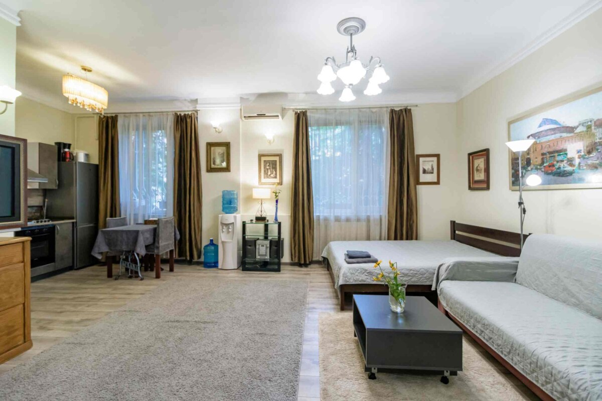 Studio kennija u moderna fl-ewwel sular. Il-bini jinsab fiċ-ċentru ta' Kyiv qrib Maidan Nezalezhnosti, viċin il-pont pedonali l-ġdid u Triq Khreshchatyk, u 5 minuti biss bil-mixi mill-istazzjon tal-metro Maidan Nezalezhnosti. L-appartament għandu sodda queen-size u, jekk ikun hemm bżonn, sodda oħra li tista' tintewa. L-istudio għandu kċina żgħira, kamra tal-banju u tojlit bil-kumditajiet meħtieġa kollha, kif ukoll TV, internet, eċċ.