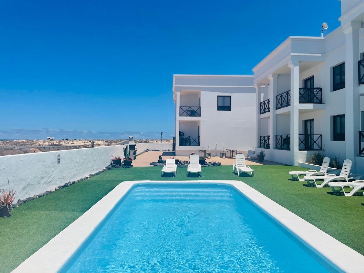 Studio miftuħ b 'pixxina f' żona pjuttost qrib iċ-ċentru ta 'Lajares f' Fuerteventura u 5m bogħod minn xtajtiet bir-ramel abjad u baqq. Windsurf, Surf, Kite,...mewġ għal dawk li għadhom jibdew u l-esperti. Bajjiet irqaq bojod moħbija...