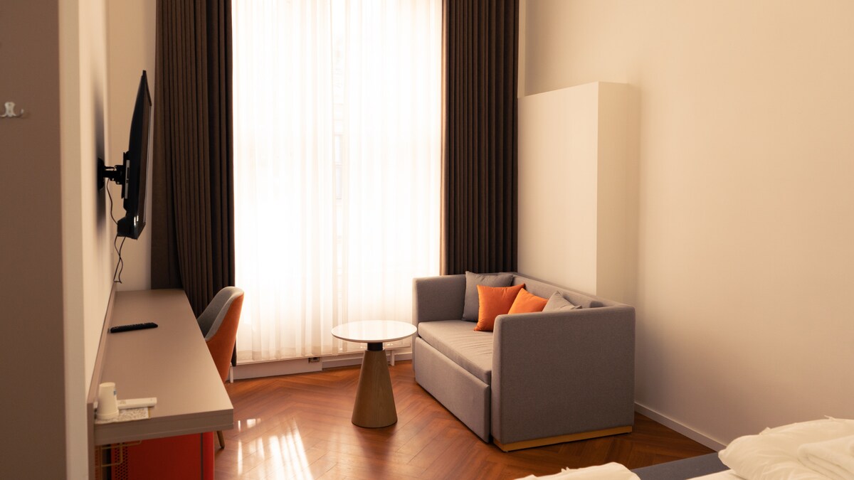 A unique stay in the heart of Vienna. Set in one of the city’s most significant neo-gothic buildings, completed in 1862 by architect Heinrich von Ferstel, this residence blends imperial charm with contemporary design. Renovated in 2025, high ceilings, and timeless interiors with modern amenities. We offer accessible luxury, perfect for travelers seeking Vienna’s heritage with today’s comfort. This Room Nr 1 / 1 St Floor My open shower offers a special sense of space.