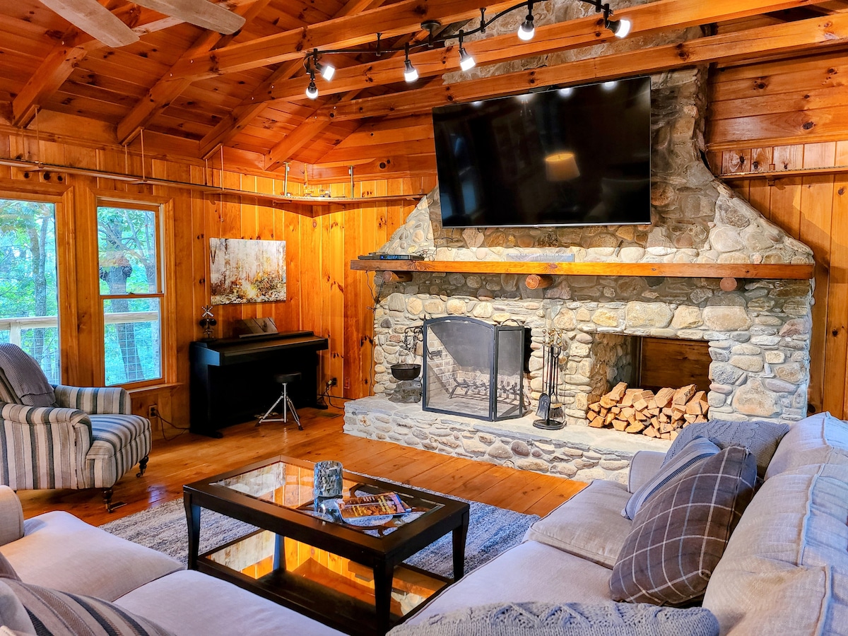 Cedar cabin w/modern interior • Front porch perfection w/bench swing & 4 rockers • Dog friendly ($50 1 dog/$100 2 dogs per stay/max 2) • Vintage bumper pool table • Backyard hammock, picnic table, 2 bench swings, fire pit, & cornhole • Play Ms Pacman (60 games), wall 4 in a row, board games • Record player • Well equipped kitchen • Wine glasses • Sunroom w/egg chairs • 2 king beds and 1 full XL over queen • 4 smart TVs • Lush landscaping • Weekends book quickly, but we have great weekday rates!