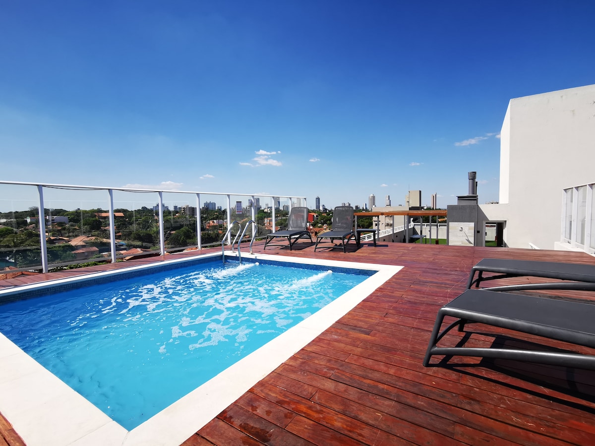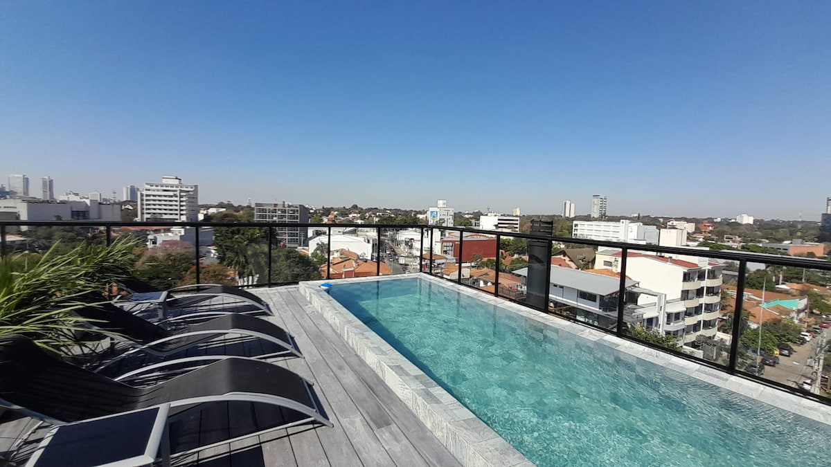 Kondominju komdu sabiħ lest għalik biex tgawdi ż-żjara tiegħek f 'Asuncion għal ftit jiem, jew ftit xhur. Dak kollu li għandek bżonn huwa inkluż. Mixja qasira lejn Shopping Villa Morra/Mariscal, supermarket u ħafna ristoranti. Użu ta 'pixxina ta' fuq is-saqaf, BBQ u gym. Gallarija kbira b 'veduta mill-isbaħ. Wifi, lożor, kċina u dak kollu li tista' tħossok qisek qiegħed id-dar.
