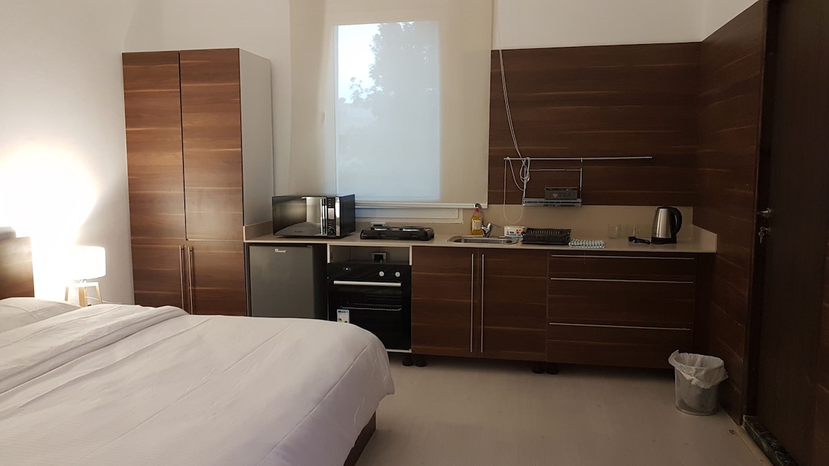 Studio stilizzat li għadu kif ġie rranġat f'Sarayat Maadi, ideali għal vjaġġaturi waħidhom, koppji jew vjaġġi tax-xogħol. Għandha sodda doppja komda, smart TV, Wi-Fi, kċina żgħira mgħammra b'kollox u kamra tal-banju. Gawdi l-veduti tal-ġnien jew irrilassa fuq il-bejt privat. Jinsab fuq Road 11, ftit passi bogħod mill-metro, Road 9, ħwienet u kafetteriji. Ratios Bakery jinsab eżatt taħt għal kafè jew snacks. Kumdità u faċilità f'post mill-aqwa f'Maadi.