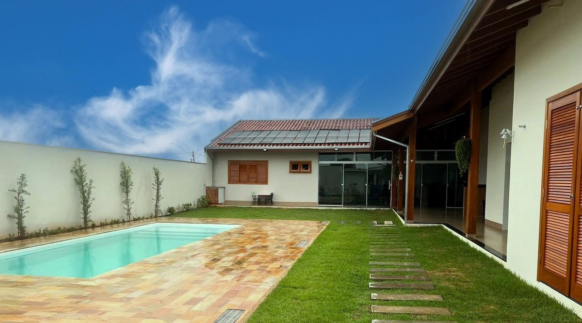 Relaxe com toda a família nesta acomodação tranquila, piscina de 8 metros aquecida por sistema solar, mesa de bilhar (sinuca), cama elástica ( pula-pula), espaço amplo, garagem para vários carros, área verde com balanços e rede, 3 mesas 22 cadeiras, Wi-Fi, TV a cabo