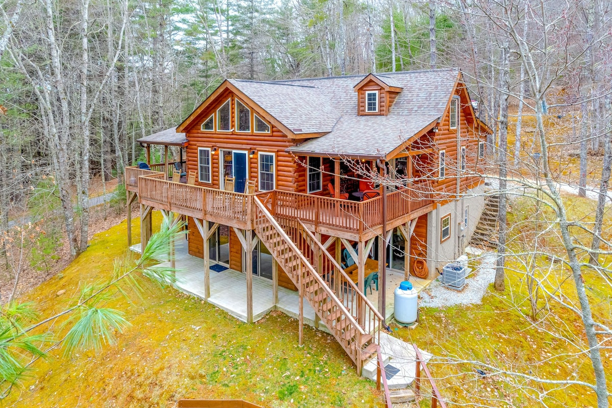 Gawdi vaganza paċifika fil-kabina fuq Apple Lake, 5 minuti minn Highlands, NC. Il-Highlands hija belt tal-muntanji affaxxinanti b 'ristoranti mill-aqwa, spa, teatru, kunċerti mużikali u xiri. Il-kabina tagħna hija miftuħa ħafna b 'soqfa għoljin, post enormi tan-nar li jaħraq l-injam, żewġ kmamar tas-sodda' l isfel u żewġ soprano f 'loft miftuħ. Minuti minn kaskati panoramiċi u mogħdijiet għall-mixi fit-tul. Gawdi r-rilassament fuq il-porch, it-tisjir, is-sajd u l-kayaking fuq il-lag. Tajjeb għall-vaganzi tal-familja/ħbieb jew vaganza romantika!