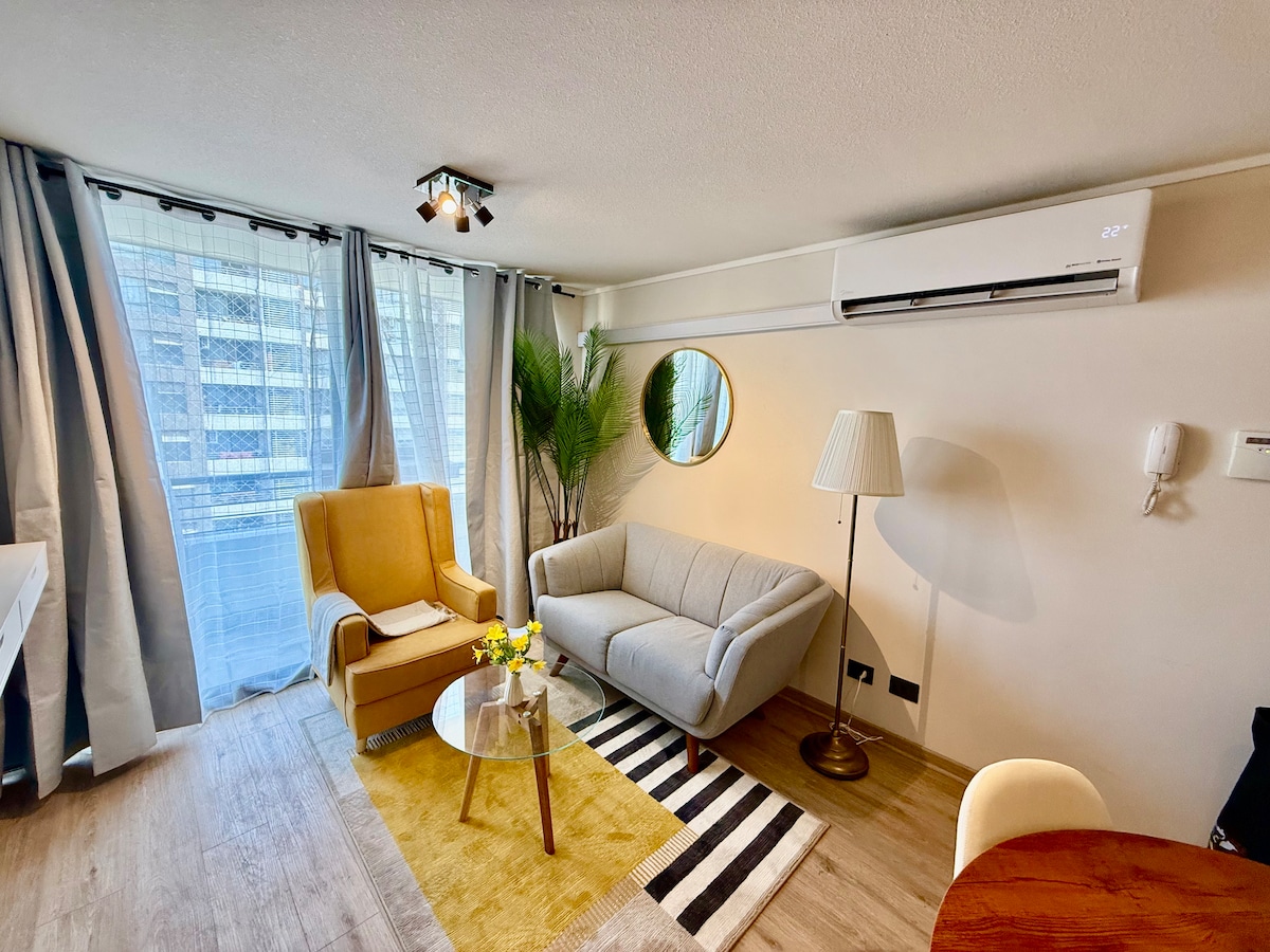 Unobstructed view 100% ✅ Prime loc. 16th floor, northeast mountain views 🏔 Modern 55 m² apartment, bright. Unique with iconic design furniture 🌎 50” Smart TV, FREE WiFi. Full bathroom with shower and fully equipped kitchen. Only 10 meters from Los Leones Metro 🚇 restaurants, supermarkets, banks, pharmacies, and more. 5 min walk to Costanera Center. 24/7 security building. 💡 Perfect for business travelers, couples, or tourists who want the best location comfort, style, and an amazing view.
