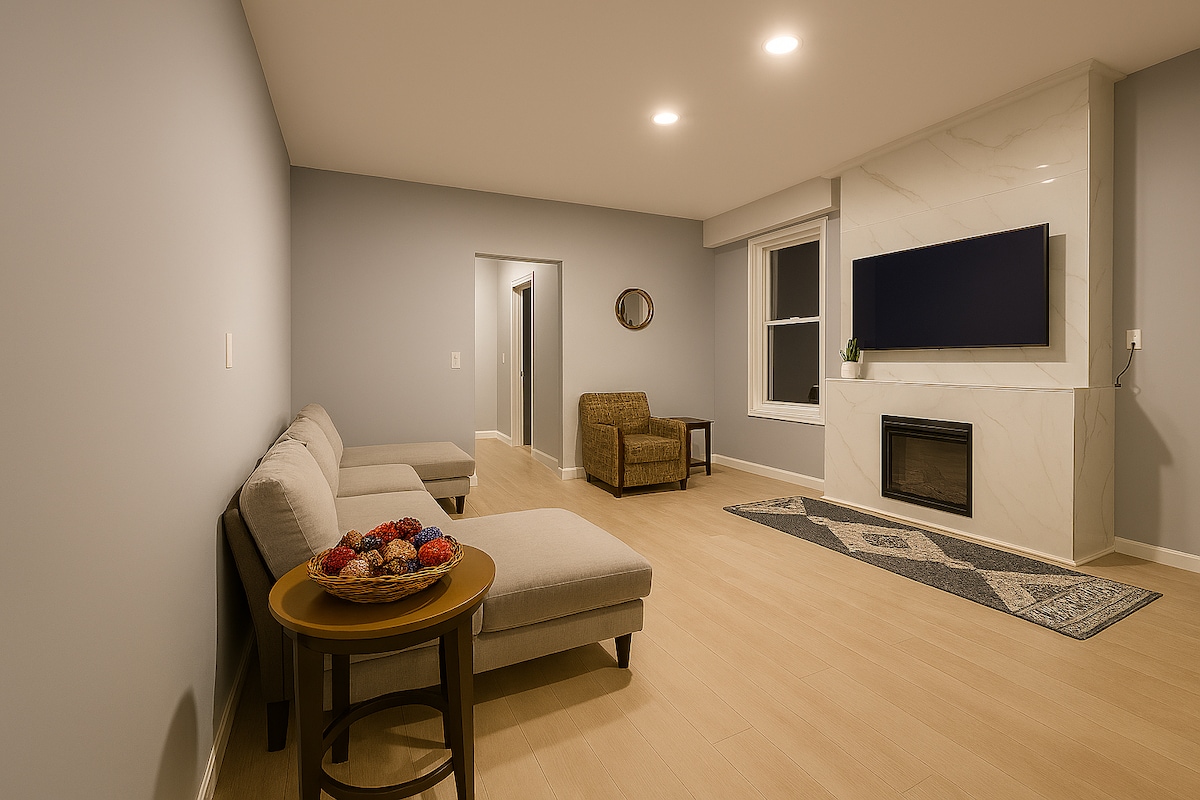 Appartament Spazjuż fl-Ewwel Sular Appartament privat b'żewġt ikmamar tas-sodda b'sodda king u queen, kċina sħiħa u salott spazjuż b'TV intelliġenti ta' 75 pulzier, sufan sodda queen ġdid u fireplace tal-gass. Ħu doċċa sħuna meta trid u rrilassa fuq il-veranda b'ħowld u fannijiet mas-saqaf. Fuq il-veranda ta' wara hemm grill tal-gass b'4 fornelli għall-bbq tiegħek. Il-Hosts joqogħdu fit-tieni sular u huma disponibbli biex jagħmlu ż-żjara tiegħek faċli u komda.