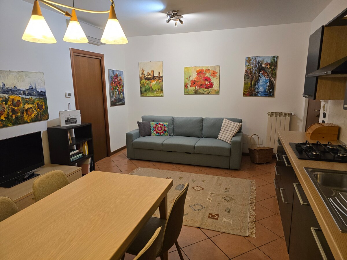 Appartament komdu u modern b 'żewġ kmamar b' parkeġġ privat u ġnien. L-appartament jinsab fis-sular t' isfel ta' bini fiċ-ċentru storiku ta' Bonate Sopra; għandu daħla indipendenti. Mgħammra b' dettalji tad-disinn u art industrijali, għandha żona tas-salott spazjuża bi kċina, mejda tal-ikel u sufan-sodda. Kamra b 'sodda doppja' queen ', kamra tal-banju u magna tal-ħasil. Ideali biex tilħaq Bergamo u l-ajruport tagħha, id-distrett tal-lag ta 'Milan u Taljan. Jekk jogħġbok żomm f' moħħok: l-ebda TV, l-ebda arja kkundizzjonata