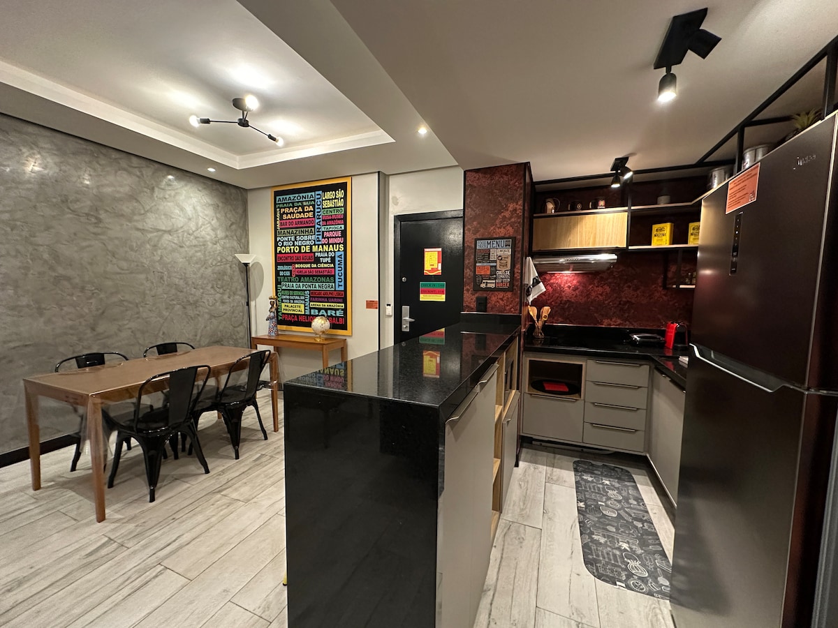 Gawdi żjara unika fil-qalba ta' Manaus! L-appartament tagħna joffri veduta mill-isbaħ tad-dar b' koppla ta' Teatro Amazonas, li tgħaqqad id-disinn modern, il-kumdità u l-post privileġġat. B' concierge 24 siegħa kuljum, Wi-Fi veloċi u dekorazzjoni li tgħaqqad il-kultura lokali mal-kumdità tad-dar, huwa l-ispazju perfett biex tirrilassa jew tesplora l-belt. Ideali għall-koppji, għall-vjaġġaturi għax-xogħol jew għal dawk li qed ifittxu esperjenzi mill-isbaħ fl-Amażonja urbana. Merħba fl-istil ta' Manaus ħaj!