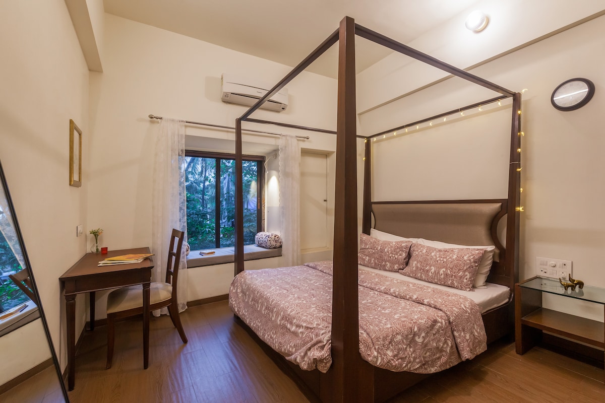 Merħba f'Oasis, il-post fejn tista' tistrieħ f'Alibaug 🌊 Dan l-appartament b'kamra tas-sodda mimlija xemx għandu sodda komda, kċina żgħira u gallarija fejn tista' tgawdi l-arja friska filgħodu. Gawdi mixjiet fuq il-bajja, kolazzjon id-dar jew aħdem bil-Wi-Fi veloċi. Tindif ta' kuljum u kantunieri komdi jagħmlu kull mument faċli u kalm. Perfett għal resets waħedhom, vaganzi ta' koppji, jew tmiem il-ġimgħa kwiet, Oasis huwa l-mini-vaganza tiegħek fejn il-ħin jibda jgħaddi aktar bil-mod ✨