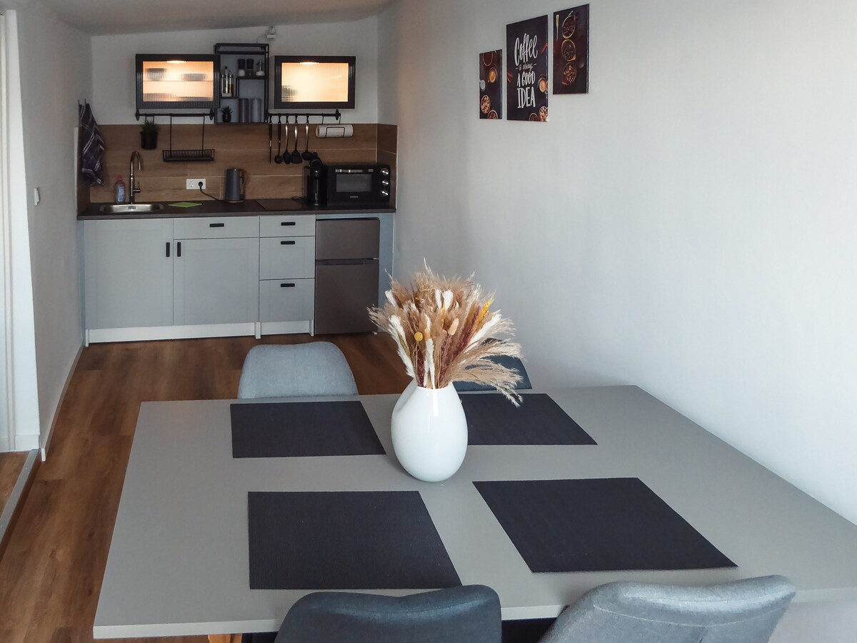 5‘ sa Ketzerbach imdawra bil-ħaxix! It-tlugħ qasir iżda wieqaf lejn l-appartament huwa ppremjat minn veduta mill-isbaħ tal-belt u l-knisja tal-elettriku, li tidħol fiha nnifisha minn twieqi panoramiċi mill-art sas-saqaf. Appartament sabiħ u mdawwal b' kamra tas-sodda waħda (sodda 1.8 x 2 m), żona tal-ikel miftuħa b' kowċ tal-irqad komdu (1.6 x 2 m), 2 siġġijiet u kċina mgħammra b' kollox kif ukoll kamra tal-banju kbira bit-tieqa. Tisħin taħt l-art, ġnien privat, WiFi, SmartTV, parkeġġ privat inkluż.