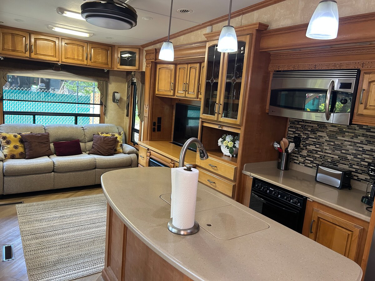 Mur 'il bogħod u oqgħod f' viċinat għani paċifiku f' RV privat tiegħek mgħammar kompletament. Minuti biss 'il bogħod mill-parks tal-belt, ristoranti, xiri u ċentru sabiħ ta' Salem. Jorqod 4 b 'mod komdu bil-kċina, iż-żona tal-ikel u l-kamra tal-banju b' doċċa. Gawdi d-daħla tiegħek u l-aċċess għal gverta kbira, pixxina, hot tub, għajxien fuq barra, bilqiegħda fuq il-mejda tan-nar, grill tal-gass u gazebo fid-dell. Ambjent perfett għal rilassament perfett!