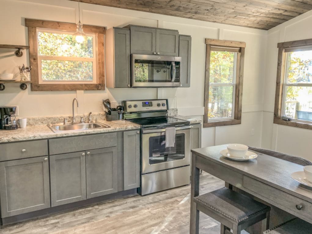 Il-kabini moderni tagħna tal-istil tal-cottage għandhom aċċenti mfassla sew bħal bjankerija tas-sodda, ħafna postijiet fejn toqgħod komdi u ħafna iktar. Il-Kabini Premier ta' 14 x 29 pied għandhom kċina kompletament funzjonali mgħammra b' oġġetti tat-tisjir, Salott ta' daqs żejjed b' sufan li jorqod ta' daqs sħiħ, doċċa b' żewġ sits fil-kamra tal-banju sħiħa, sodda queen fil-kamra tas-sodda ewlenija, kif ukoll veranda mgħottija perfetta biex tixrob il-kafè ta' filgħodu tiegħek. Tiżdied tariffa għat-tindif ta' $ 45 għal kull annimal domestiku (1) ma' dan il-listing. Jekk jogħġbok ibgħatli messaġġ biex nirranġa.