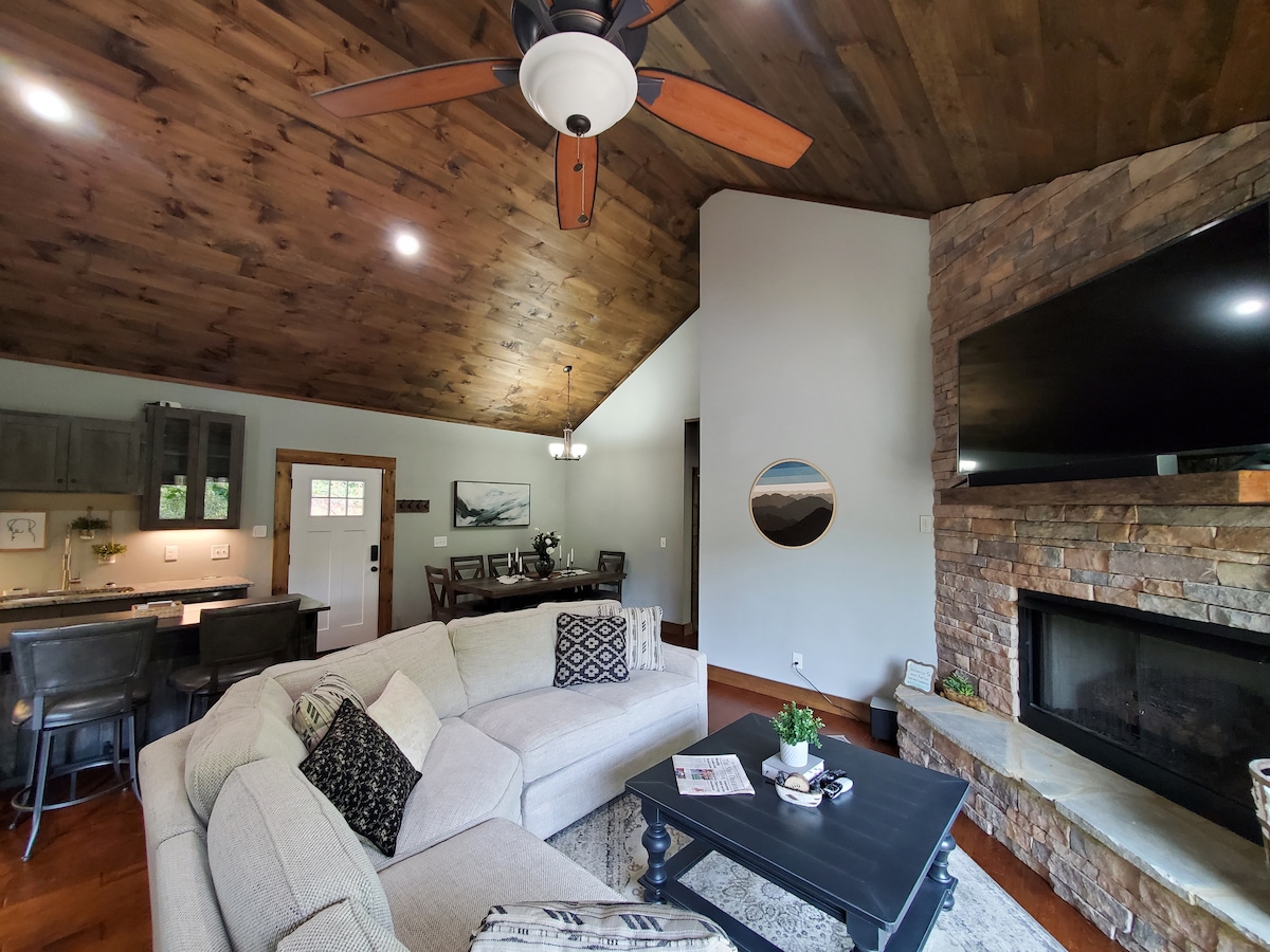 Irtir tal-muntanji mill-isbaħ u kwiet fil-Ġeorġja fuq ix-Xmara Toccoa. 3 kmamar tas-sodda ewlenin (1 king/2 queen) u kamra tal-bunk b '4 sodod. Il-kmamar tal-banju kollha fihom doċoċ walk-in. Kċina kompletament stokkjata b 'magna tal-kafè Keurig u bar imxarrab fuq livell aktar baxx. Il-gverta testendi sal-ilma. Għandu wkoll fossa tan-nirien, ikliet fuq barra, grill u ħafna postijiet fejn toqgħod bilqiegħda fuq barra. Post eċċellenti fejn tista 'tistad, tubing u kayaking fuq il-post. 20 minuta lejn iċ-ċentru ta' Blue Ridge, 10 minuti lejn iċ-ċentru ta 'McCaysville u bogħod minn Lake Blue Ridge