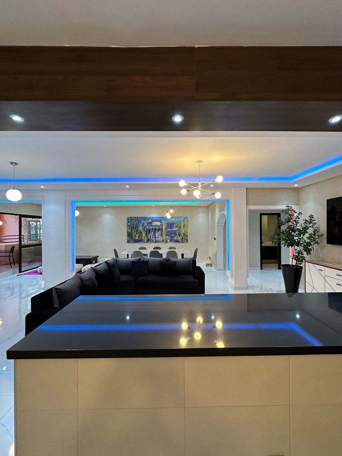 Gawdi żjara sabiħa f' dan il-Condo Luxury kbir ta' 160m2. Il-kċina, iż-żona tal-ikel u ż-żona tas-salott jinsabu kollha fi spazju miftuħ. Il-post tal-appartament jinsab fl-iktar parti lussuża ta' Marrakech fiċ-ċentru ta' Hivernage. Kull wieħed mit-3 ikmamar tas-sodda għandu Saqqu ta' Daqs Reġina kbir b' Kamra tal-banju kompluta ħdejn xulxin. B' kollox 2 Kmamar tal-banju b' doċċa. Iż-żona tal-Għajxien tinkludi Televixin Intelliġenti kbir ta' 80 pulzier b' Netflix. Il-konnessjoni tal-Internet hija Fiber, is-sawm disponibbli sa 100mbps.