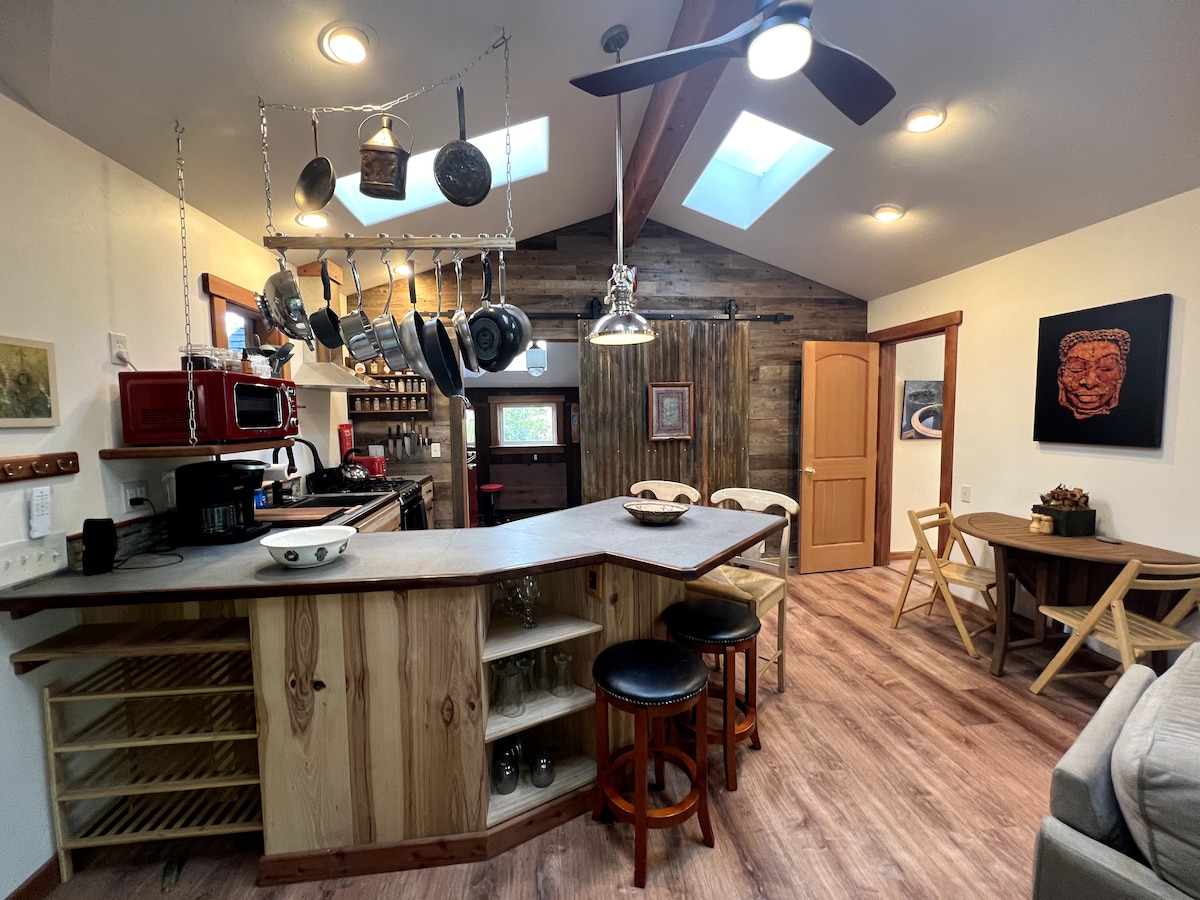 Żommu sempliċi f 'dan il-post kwiet u li jinsab fiċ-ċentru li jinsab ftit minuti' l bogħod miċ-ċentru u l-aktar mogħdijiet sbieħ għall-mixi f 'Mendocino jibdew fil-proprjetà! Din il-kabina tal-foresta kostali hija l-unika proprjetà b 'aċċess għall-mogħdija ftit magħrufa tan-nofsinhar tal-bajja ta' Gulch State Park. Ġib iż-żraben tal-hiking tiegħek. Ftit passi 'l bogħod mix-xatt u mogħdijiet oħra li jgħaqqdu bħall-mogħdija famuża tal-kaskata, il-mogħdija ta' Mendocino headlands, u l-mogħdija tat-Tramuntana. Ejja għix il-maġija!