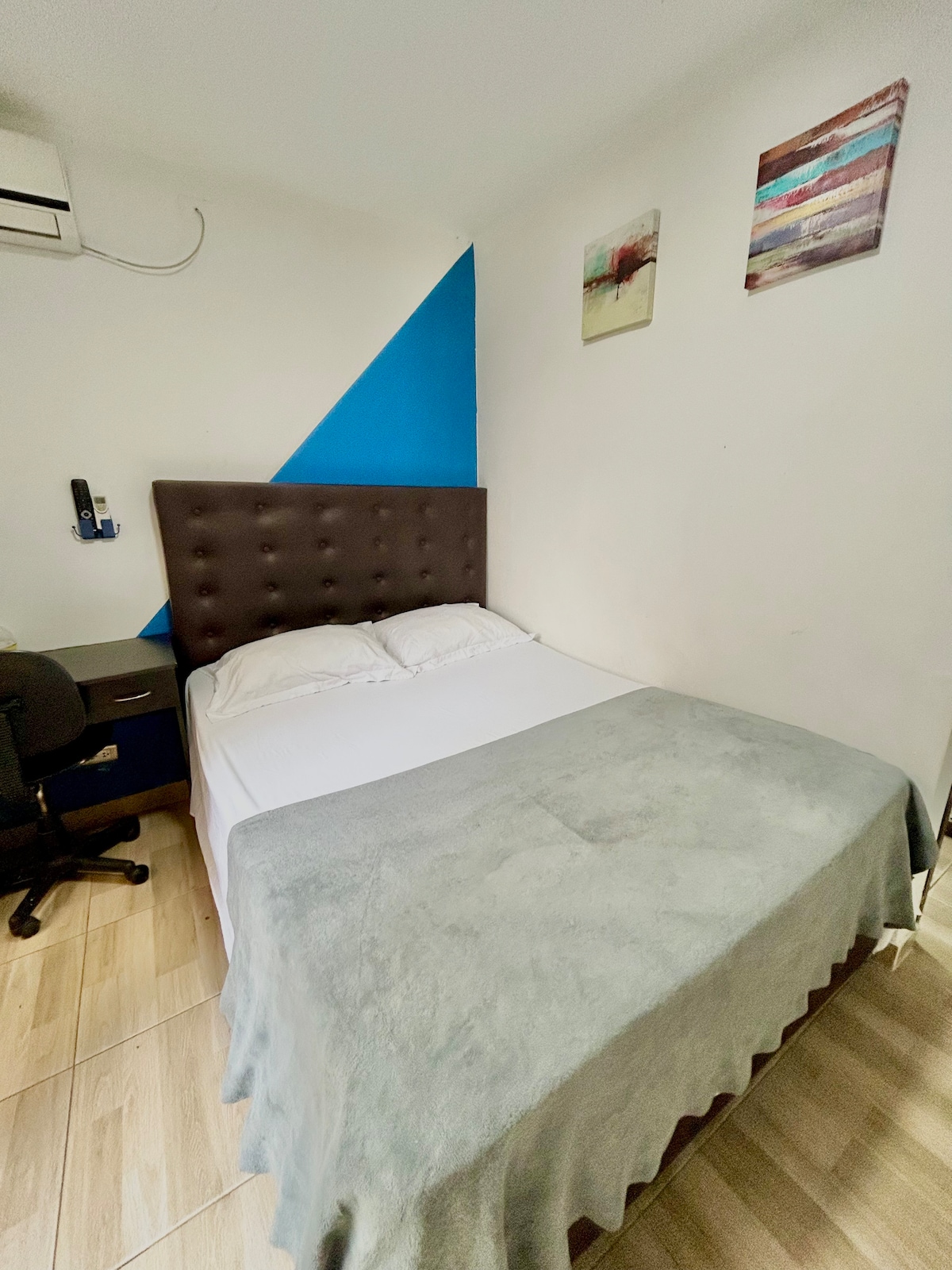 Este lugar tiene una ubicación estratégica: ¡será muy fácil planear tu visita! Habitación con cocina y baño independiente, ubicadísima, excelente espacio y experiencia de alojamiento. Con todo lo necesario para pasar una buena estadía en uno de los lugares estratégicos y centrales de Bogotá. Parques, centros comerciales, restaurantes y excelente acceso a transporte público y avenidas principales. Súper iluminada, tranquila, dotada y con vista a la ciudad. cama semidoble. En 5 piso sin ascensor.