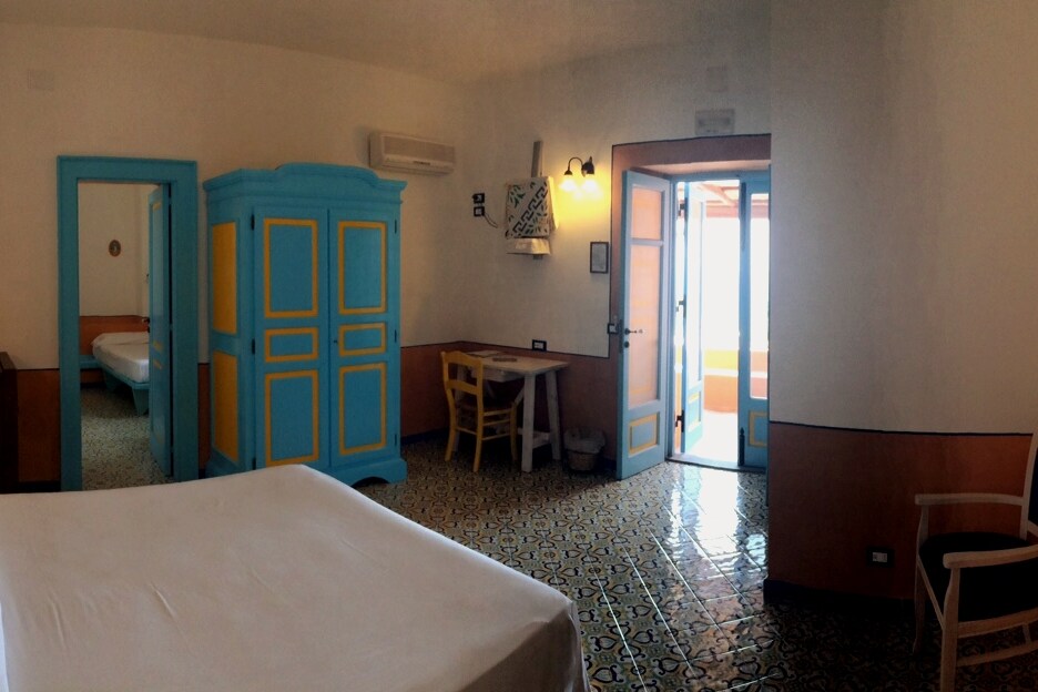 Ampia camera con patio privato, situata all'interno dell'Hotel Villa Cute, un'antica residenza dell'800 un tempo dedicata alla produzione della Malvasia, il celebre vino dolce delle Isole Eolie. Ristrutturata nel 2021, conserva ancora oggi la traccia del torchio utilizzato per la spremitura dell'uva, un dettaglio storico unico che racconta la tradizione eoliana. La camera è spaziosa ed è utilizzabile come doppia/matrimoniale o come soluzione per famiglie o piccoli gruppi fino a 4 persone