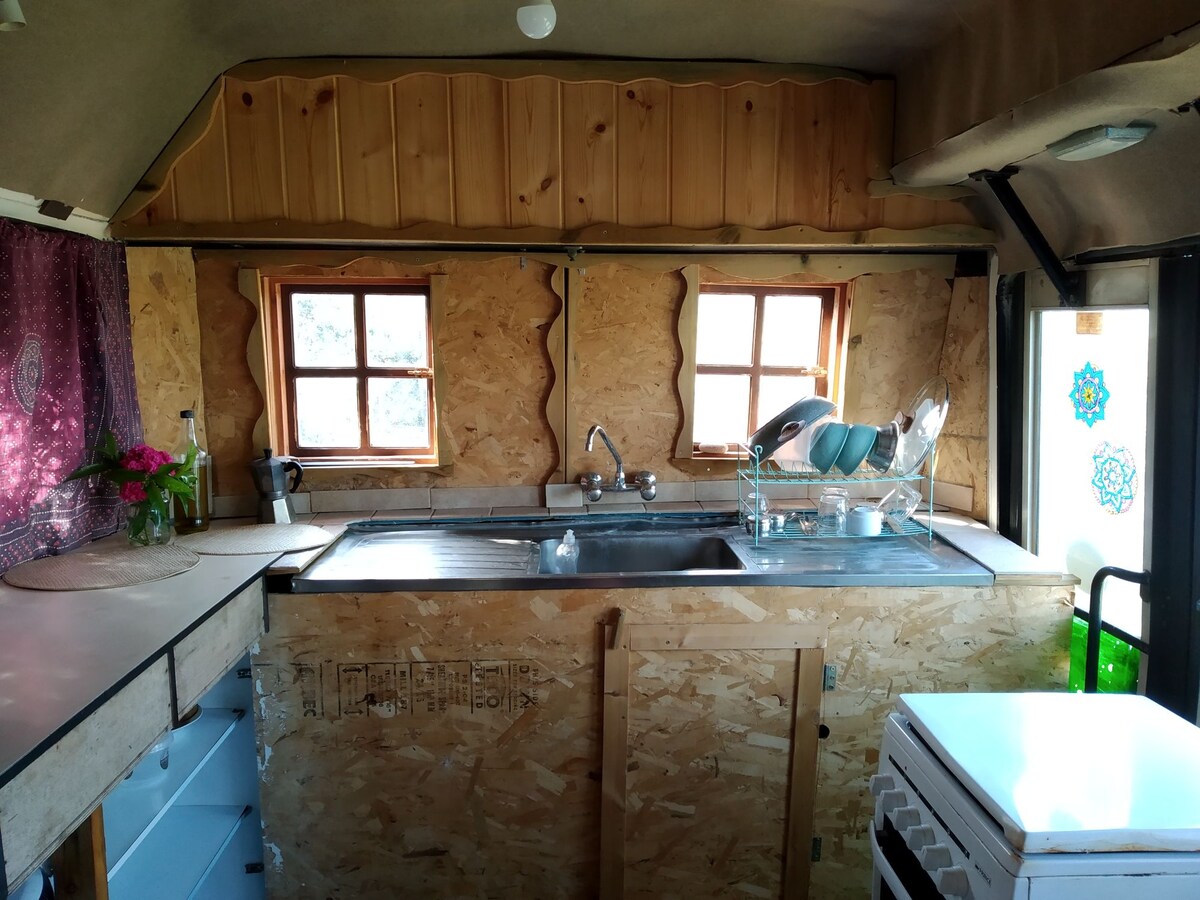 Il-karozza tal-linja hija ddisinjata bħala spazju naturali u miftuħ, mibnija minn materjali naturali Xogħol idejja u ta' żewġi. Il-karozza tal-linja tinsab f'ġnien tal-frott mill-isbaħ b'ħafna baqar ta' tipi differenti Barmil tat-tiġieġ, fossa tan-nar, tojlit u doċċa f'bini separat 3 metri 'l bogħod mill-karozza tal-linja. It-tojlits huma tojlits tal-kompost li ma jużawx ilma Minflok użajt segħar... esperjenza sabiħa għal min qatt ma ppruvaha. Il-kċina mibnija mill-injam, fiha platti, tazzi, pożati Taġen, qsari, ħwawar, żejt taż-żebbuġa, kafè, zokkor Il-kċina għandha friġġ, forn b'cooker u toaster tal-elettriku Ħafna xkafef u spazju għall-ħażna. Salott b'sufan, mejda żgħira, air conditioner kbir Hemm kamra tas-sodda fl-aħħar tal-karozza tal-linja Gawdi