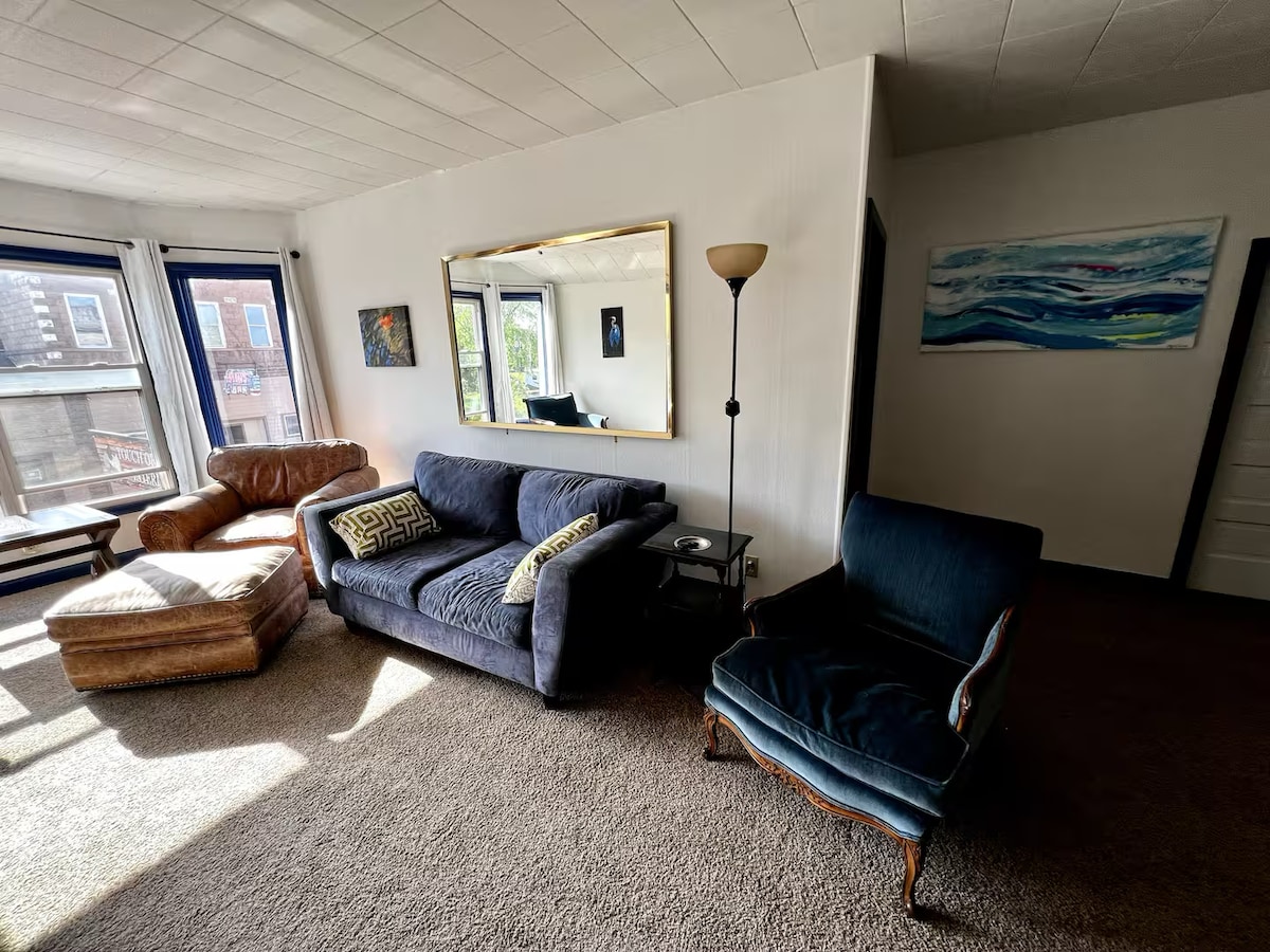 This bright and airy upper-level 2-bedroom apartment located in downtown Rhinelander. Enjoy restful nights in each of the well-appointed bedrooms. Featuring one king bed and one queen with cozy bedding. The spacious living room complete with a comfy sofa, chair and smart TV. Fully Equipped Kitchen stocked with cookware, dishes, utensils, and modern appliances. Clean & Modern Bathroom The bathroom includes a full tub/shower combo. Close to local shops, restaurants, parks, and attractions.