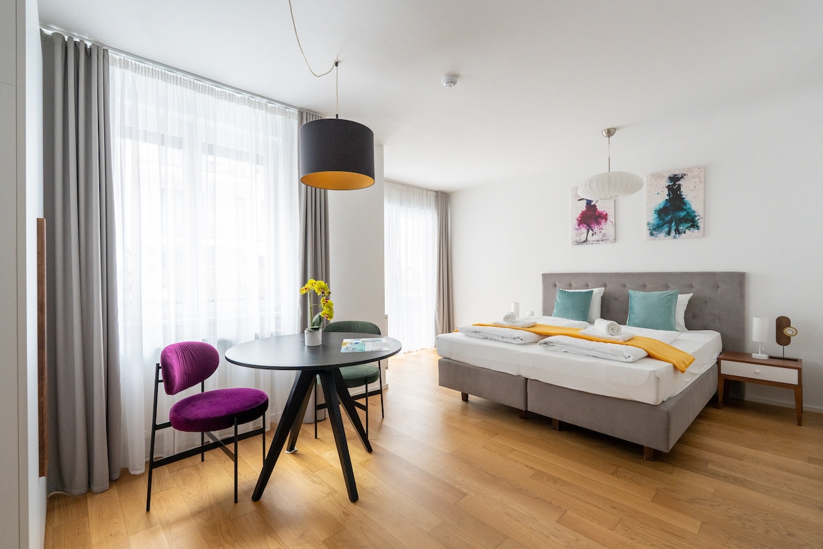 Welcome to our Artful 1BR Suite, located directly in front of the U1 metro station Altes Landgut. Stephansplatz and Vienna’s city center are just 10 minutes away by metro. Key Highlights: • Professionally managed property • Paid garage parking available on the premises • On-site amenities: luggage lockers, laundry room & lobby