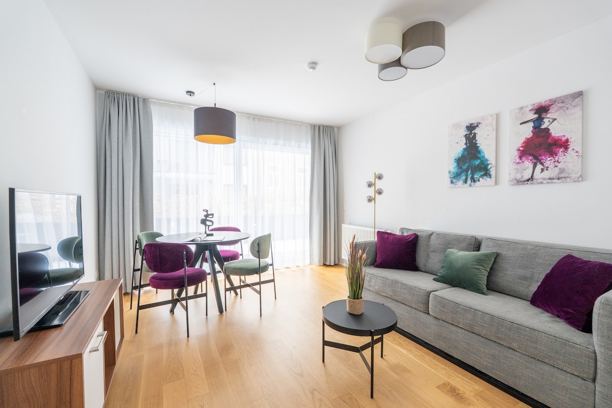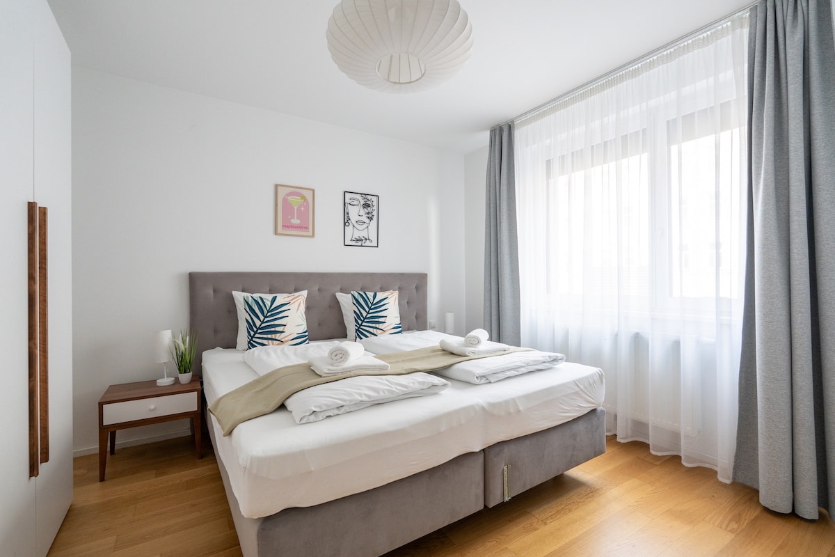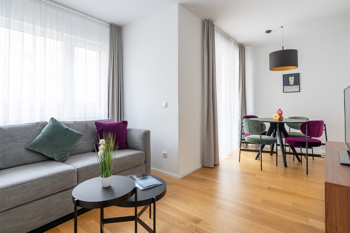 Welcome to our Sleek 1BR Suite, located directly in front of the U1 metro station Altes Landgut. Stephansplatz and Vienna’s city center are just 10 minutes away by metro. Key Highlights: • Professionally managed property • Paid garage parking available on the premises • On-site amenities: luggage lockers, laundry room & lobby