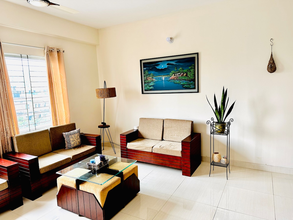 Appartament Stili u Lussuż b' 2 Kmamar tas-Sodda! Dan l-appartament modern b' arja kkundizzjonata joffri kumdità għal 4 klijenti bi kmamar tas-sodda spazjużi, tojlits u komuni u għodod tal-kċina mgħammra b' kollox flimkien ma' microwave, forn, friġġ u sett ta' ikliet ta' 32 biċċa u mejda tal-ikel lussuża. Gawdi WiFi b' veloċità għolja, Smart TV, 2 gallarija, faċilitajiet tal-ħasil tal-ħwejjeġ u sigurtà tas-CCTV 24 siegħa kuljum. Post komdu qrib Square, Shamorita, BRB & Health & Hope Hospitals, Bashundhara City Mall u l-Istazzjon tal-Metro. Ibbukkja Issa!!