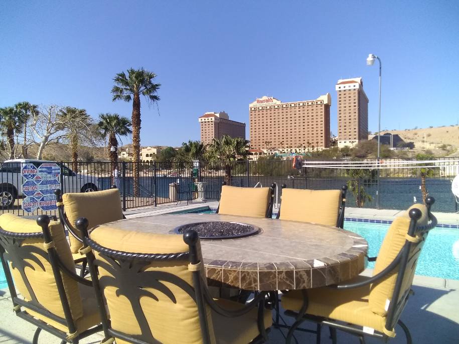 Cottages Faċċata tax-Xmara u RV Resort jinsabu fuq ix-Xmara Colorado direttament minn Laughlin Casinos b 'sewqan ta' 10 minuti. Kull Cottage li tinsab kompletament għandha kċina, salott u kamra tas-sodda. Il-kumditajiet jinkludu bajja privata bir-ramel, baċir tad-dgħajjes, pixxina msaħħna, spa, clubhouse, kamra tal-ħasil u WiFi. Jinsabu fiċ-ċentru għat-tgawdija perfetta ta 'sajd, tbaħħir, għawm, ikla u rilassament. Veduta mill-isbaħ tal-pixxina u x-xmara flimkien ma 'każinò mit-tieqa tas-salott.