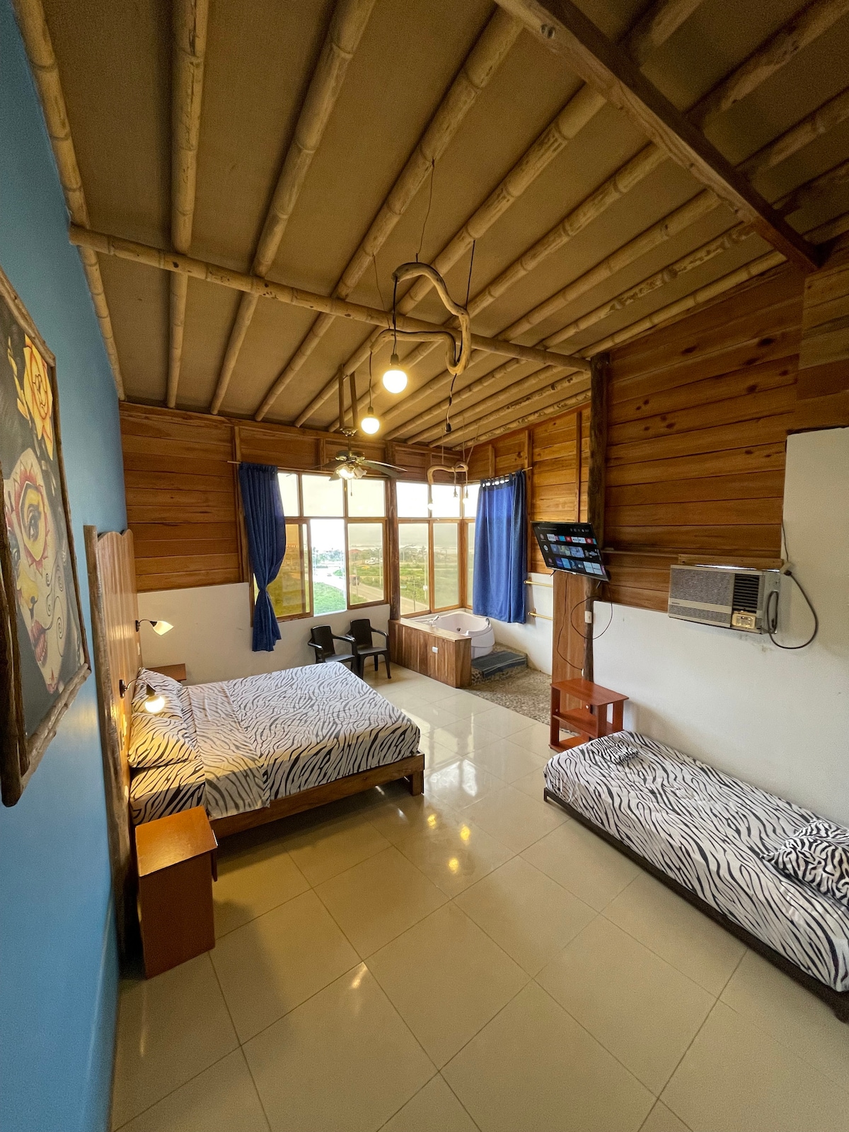 Suite elegante frente al mar , perfecta para desconectar y disfrutar. Relájate en el hidromasaje privado al aire libre, con vista directa al océano y la brisa marina . La suite incluye una cómoda cama King Size, aire acondicionado y un diseño que combina confort con estilo costero. Ideal para escapadas románticas, festejos de ocasiones especiales o unos días de descanso frente al mar Además, cuenta con un hall equipado con dos sofás cama, incluye una área con cafetera, microondas wuaflera