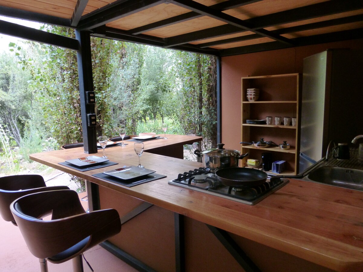 Kabina privata rustika-modern li tinsab 2 blokki 'l bogħod mill-Plaza de Pisco Elqui,qrib ristoranti u negozji. Parkeġġ privat.1 kamra tas-sodda b' kamra tal-banju privata ,1 sodda ta' 2 persuni (lożor, kutri, kutra, imħaded u kuxxini) .1 lampa, lampa 1, 2 tdifel tas-sodda, sufan, għamara antika restawrata u kelliem tal-Bluetooth.1 stufi elettriċi għax-xitwa. Kċina,dishwasher u friġġ fuq it-terrazzin (pots, earthenware, pożati, kitla,eċċ.) u grill charcoal. Barra minn hekk hemm ħafna veġetazzjoni.
