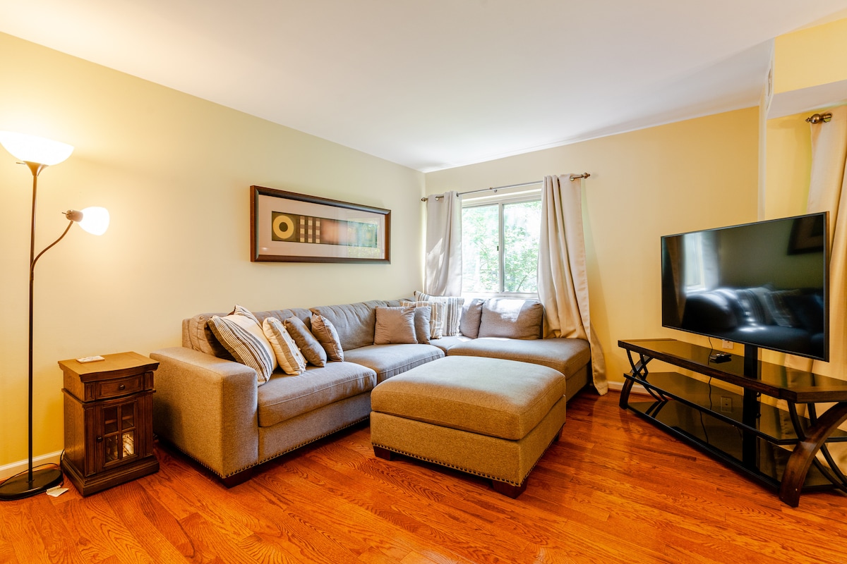 Enjoy a cozy & private stay in this large walkout basement suite with its own entrance. 1.9 miles to Metro! Perfect for couples, solo travelers, or small families, it features a comfortable queen bedroom, a well-lighted, spacious living room (20' x 10') a sofa that converts to twin bed, and a full bathroom with a standing shower. The TV (Roku and YouTube TV) offers plenty of entertainment as you enjoy coffee and tea in the refreshment nook with coffee maker, electric kettle, and all utensils.