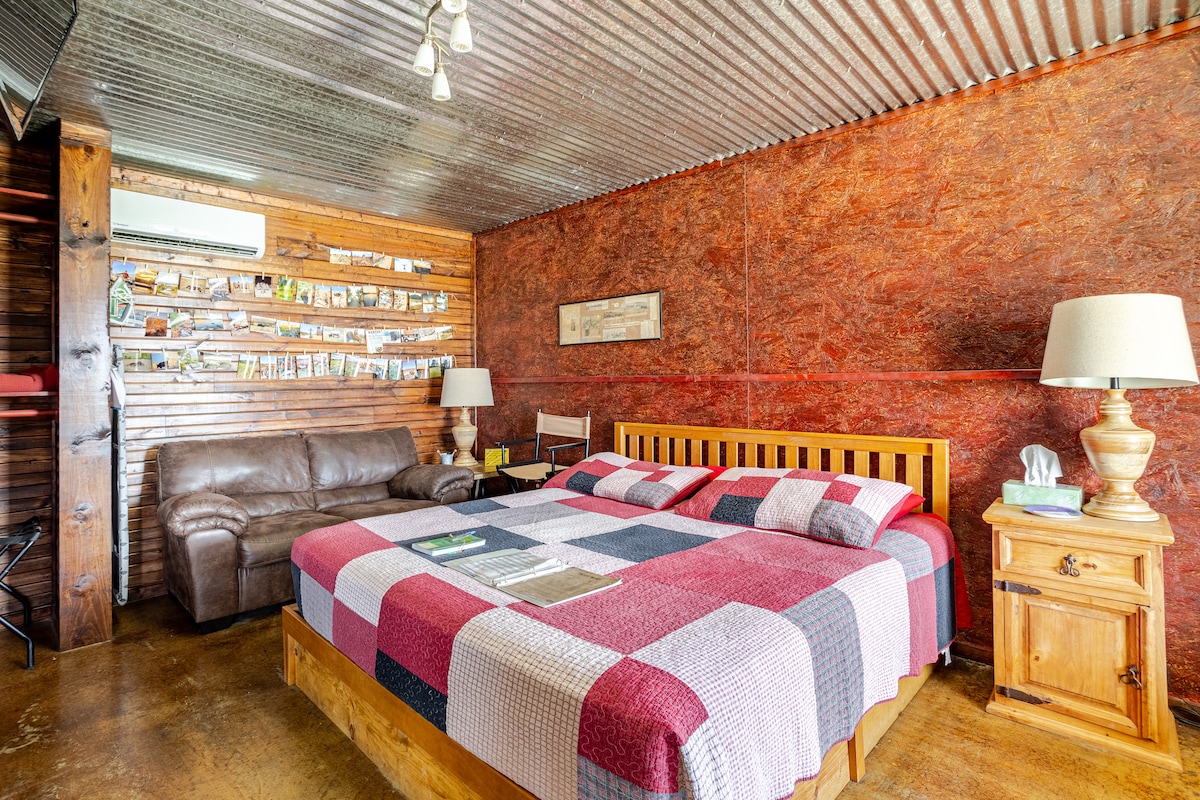 The Autohaus Loft is a peace retreat in historic Medicine Park, Oklahoma near the scenic Wichita Mountains Wildlife Refuge. Żona popolari ta' resort tal-bidu tas-seklu 20 fiha strutturi storiċi taċ-ċagħaq. Mibnija fis-snin 1920 u ispirata mill-Mudell T ta' Ford, tinsab 'il bogħod bil-mixi mix-xiri, l-ikel, il-mixjiet fit-tul, is-sajd, l-għawm u iktar. Din is-suite tat-tieni sular hija mżejna b' kuluri tal-ħamrija u fiha art antika tal-injam iebes. Jekk jogħġbok aqra r-regoli tad-dar bir-reqqa.