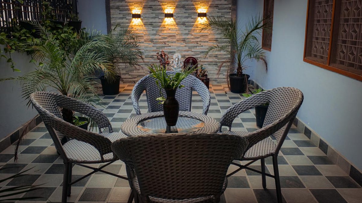 Evita l-kawża tal-belt u rrilassa ġewwa Grace Ganga View Retreat — żjara paċifika ta' 2BHK biss 2 km 'il bogħod mill-Ghat Assi. Din id-dar komda, li tinsab f' karreġġata kwieta, toffri l-kumditajiet moderni kollha, gallarija privata, kmamar tas-sodda AC u kċina mgħammra b' kollox. Kemm jekk qiegħed hawn biex tiskopri kif ukoll jekk qiegħed tistrieħ, l-ispazju kalm u akkoljenti tagħna huwa l-bażi perfetta biex tesperjenza r-ruħ reali ta' Varanasi — b' mod paċifiku. żomm f'moħħok: l-aħjar post minn fejn tara l-veduta huwa t-terrazzin fil-5 sular